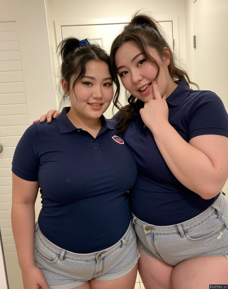 Body: pretty face, plus size supermodels, (overweight), (fat), pretty, 19, hot stunning face detail, (twins), Outfit: ((navy polo top)), light gray Jean shorts, modest, uniform Pose: inviting, enjoying each other , baddest bitches, stoic, Location: bathroom, (Two korean plump women filming a hot tiktok), messy tousled hair, dark super short hair,