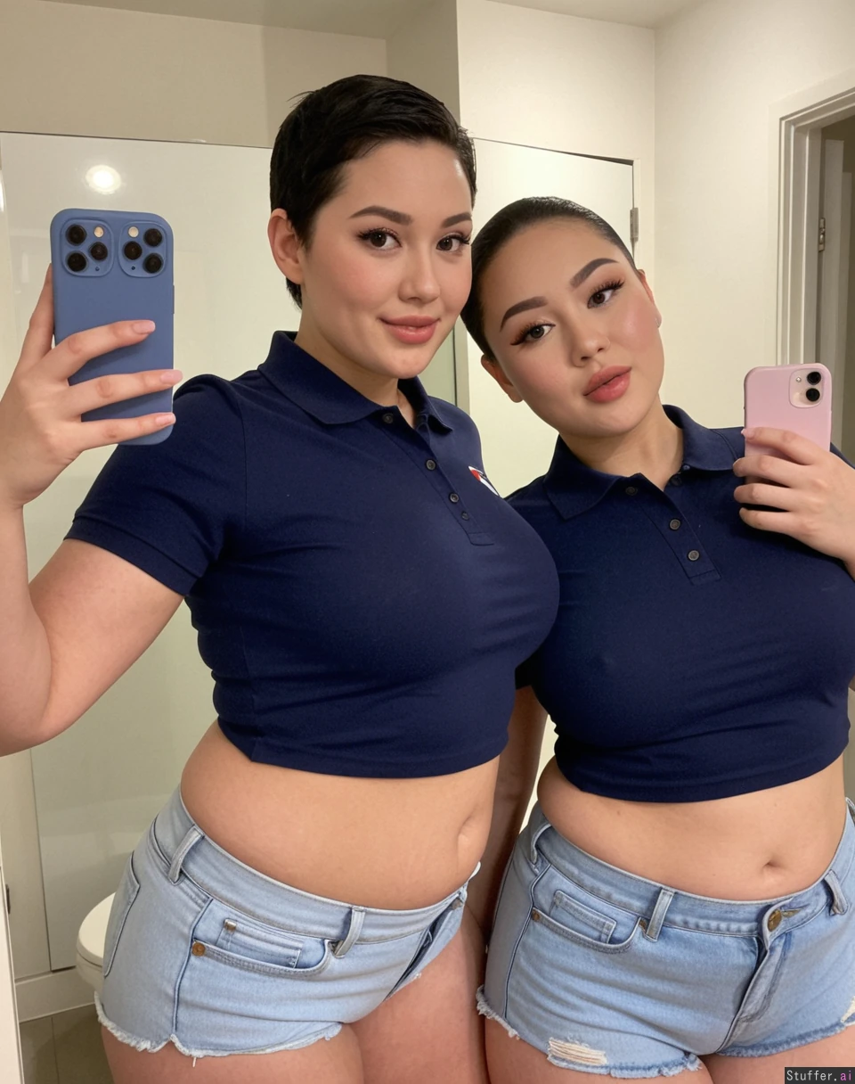 Body: pretty face, plus size supermodels, (overweight), (fat), pretty, 19, hot stunning face detail, (twins), Outfit: ((navy polo top)), light gray Jean shorts, modest, uniform Pose: inviting, enjoying each other , baddest bitches, stoic, Location: bathroom, (Two korean plump women filming a hot tiktok), greased slicked back pixie, dark super short hair,