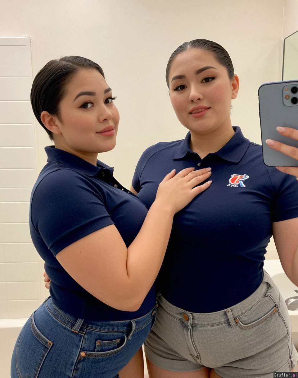 Body: pretty face, plus size supermodels, (overweight), (fat), pretty, 19, hot stunning face detail, (twins), Outfit: ((navy polo top)), light gray Jean shorts, modest, uniform Pose: inviting, enjoying each other , baddest bitches, stoic, Location: bathroom, (Two korean plump women filming a hot tiktok), greased slicked back pixie, dark super short hair,