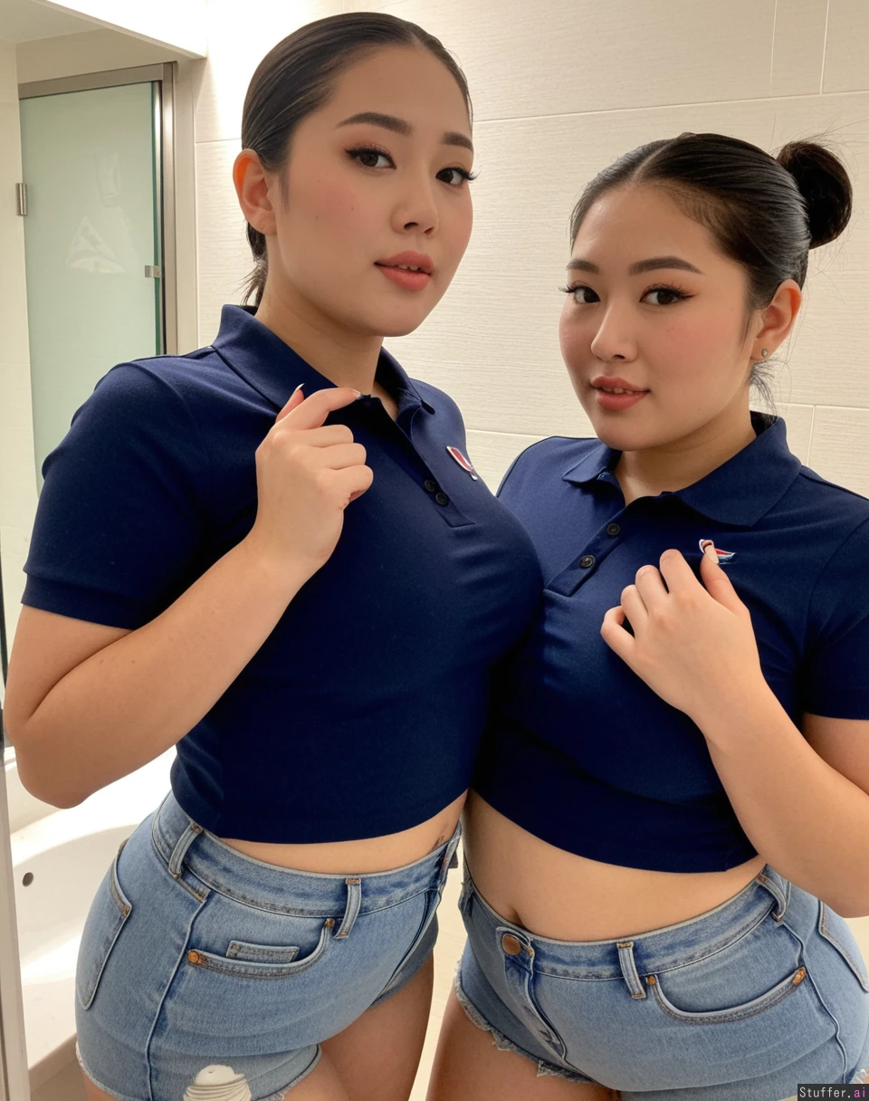 Body: Korean, pretty face, plus size supermodels, (overweight), (fat), pretty, 19, hot stunning face detail, (twins), Outfit: ((navy polo top)), light gray Jean shorts, modest, uniform Pose: inviting, enjoying each other , baddest bitches, stoic, Location: bathroom, (Two korean plump women filming a hot tiktok), greased slicked back pixie, dark super short hair,