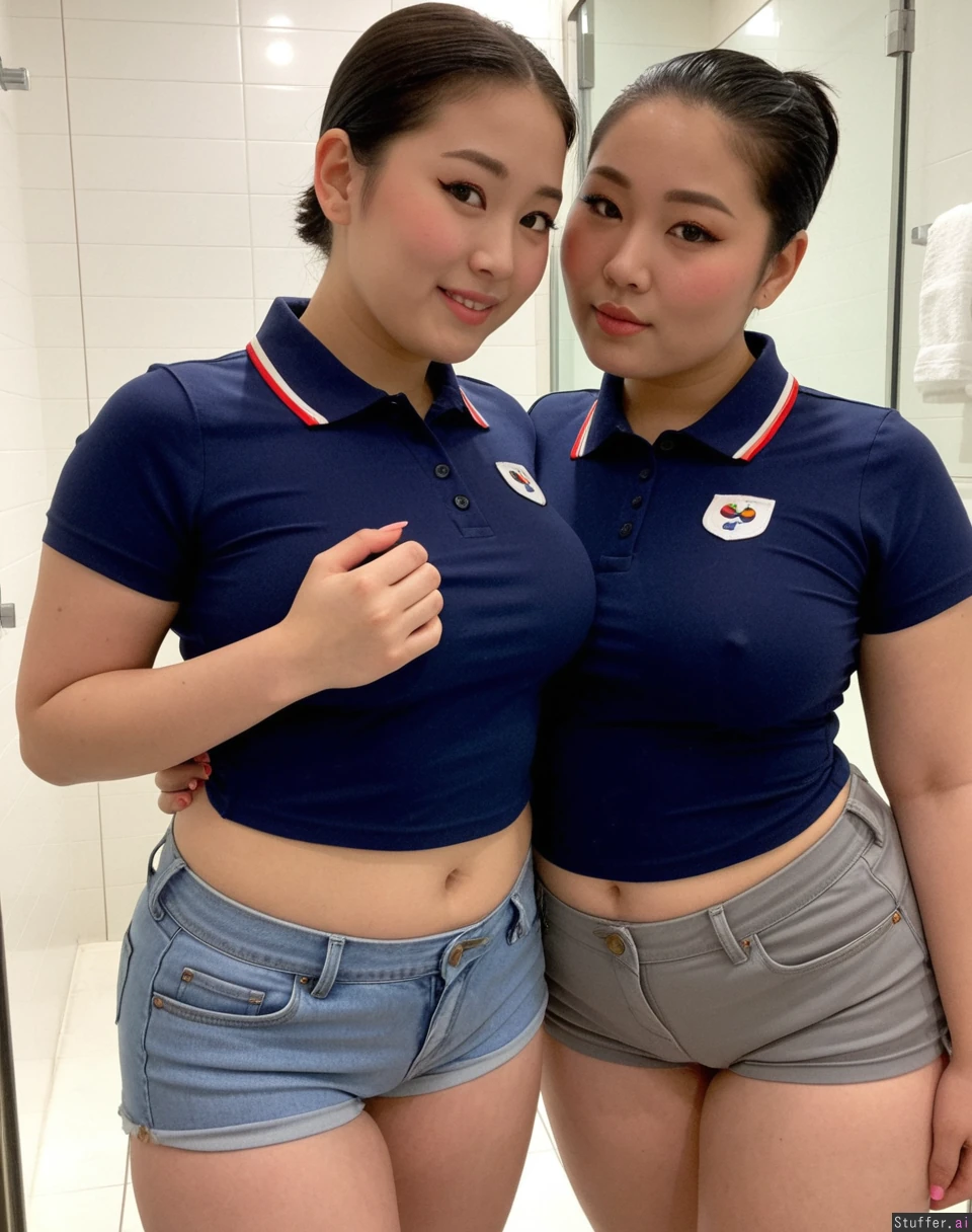 Body: Korean, pretty face, plus size supermodels, (overweight), (fat), pretty, 19, hot stunning face detail, (twins), greased slicked back pixie, dark super short pixie cut, Outfit: ((navy polo top)), light gray Jean shorts, modest, uniform Pose: inviting, enjoying each other , baddest bitches, stoic, Location: bathroom, (Two korean plump women filming a hot tiktok),