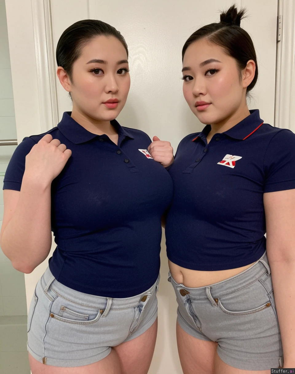 Body: Korean, pretty face, plus size supermodels, (overweight), (fat), pretty, 19, hot stunning face detail, (twins), greased slicked back pixie, dark super short pixie cut, Outfit: ((navy polo top)), (light gray Jean shorts), modest, uniform Pose: inviting, showing off each other , baddest bitches, stoic, Location: bathroom, (Two korean plump women filming a hot tiktok),