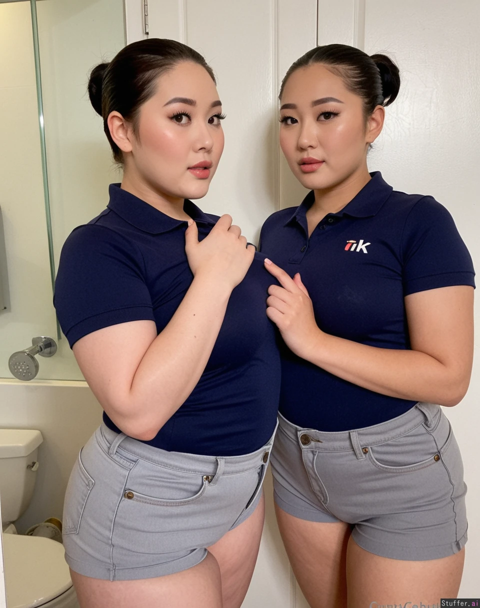 Body: Korean, pretty face, plus size supermodels, ((overweight)), ((fat)), pretty, 19, hot stunning face detail, (twins), greased slicked back pixie, dark super short pixie cut, Outfit: ((navy polo top)), (light gray Jean shorts), modest, uniform Pose: inviting, showing off each other , baddest bitches, stoic, Location: bathroom, (Two korean plump women filming a hot tiktok),