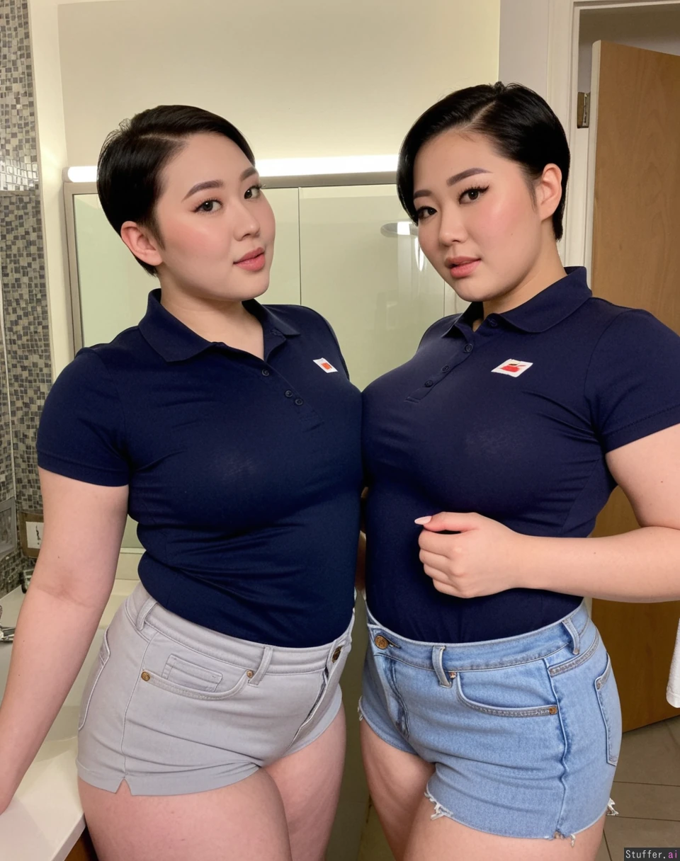 Body: Korean, pretty face, plus size supermodels, ((overweight)), ((fat)), pretty, 19, hot stunning face detail, (twins), greased slicked back pixie, dark super short pixie cut, Outfit: ((navy polo top)), (light gray Jean shorts), modest, uniform Pose: inviting, showing off each other , baddest bitches, stoic, Location: bathroom, (Two korean plump women filming a hot tiktok),