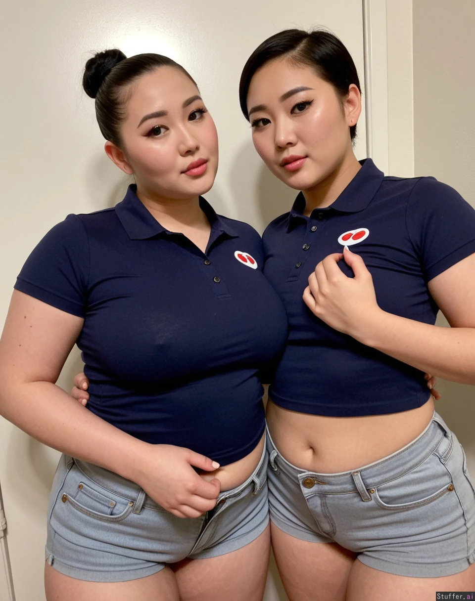 Body: Korean, pretty face, plus size supermodels, ((overweight)), ((fat)), pretty, 19, hot stunning face detail, (twins), greased slicked back pixie, dark super short pixie cut, Outfit: ((navy polo top)), (light gray Jean shorts), modest, uniform Pose: inviting, showing off each other , baddest bitches, stoic, Location: bathroom, (Two korean plump women filming a hot tiktok), big bitches