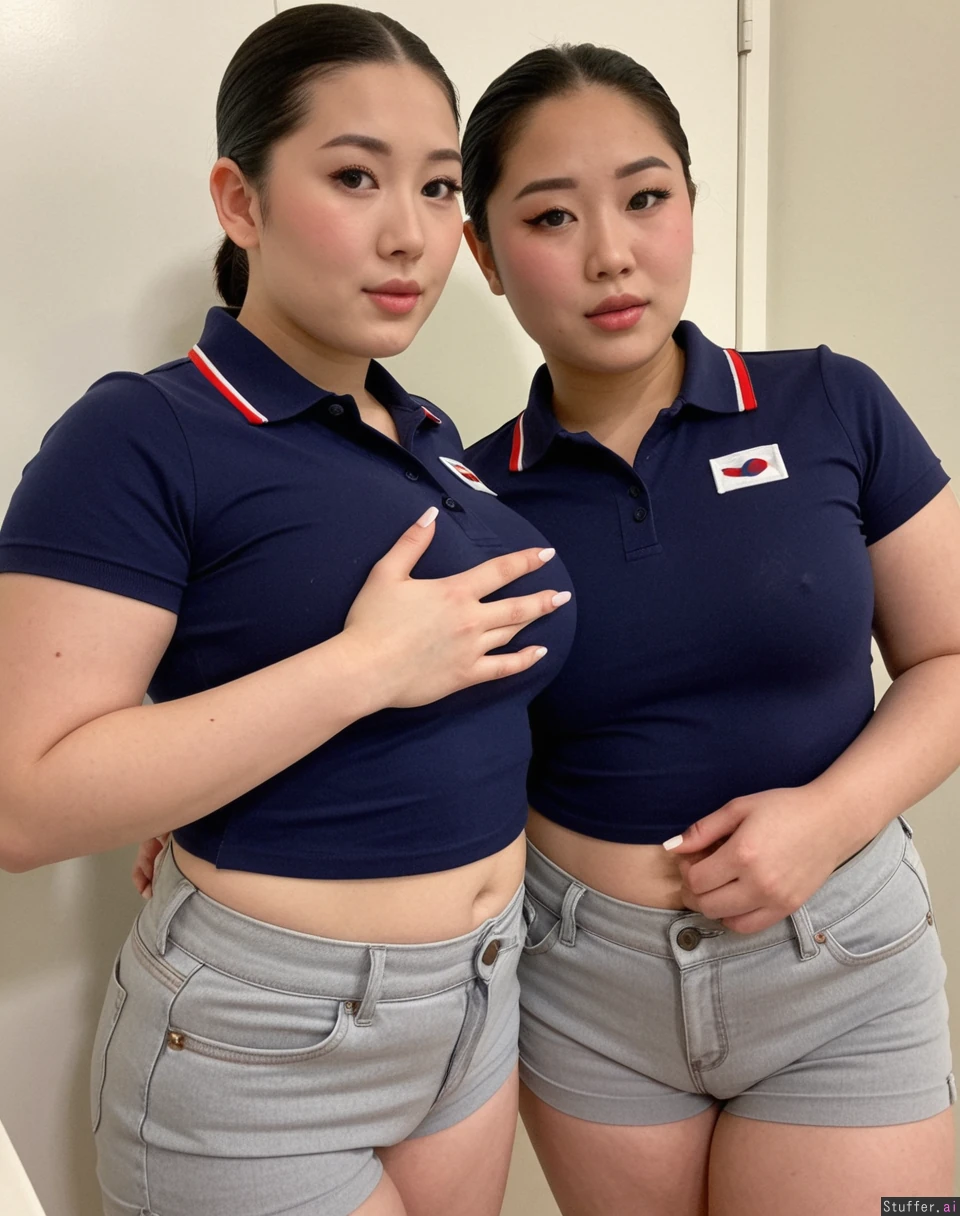 Body: Korean, pretty face, plus size supermodels, ((overweight)), ((fat)), pretty, 19, hot stunning face detail, (twins), greased slicked back pixie, dark super short pixie cut, Outfit: ((navy polo top)), (light gray Jean shorts), modest, uniform Pose: inviting, showing off each other , baddest bitches, stoic, Location: bathroom, (Two korean plump women filming a hot tiktok), (big fat bitches)