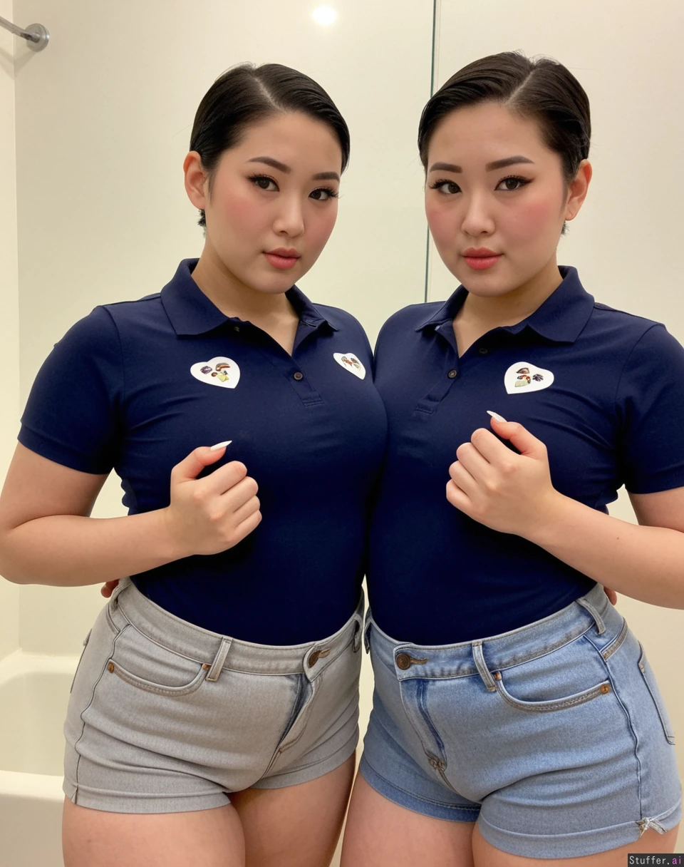 Body: big Korean bitches, pretty face, (plus size supermodels), ((overweight)), ((fat)), pretty, 19, hot stunning face detail, (twins), greased slicked back pixie, dark super short pixie cut, Outfit: ((navy polo top)), (light gray Jean shorts), modest, uniform Pose: inviting, showing off each other , baddest bitches, stoic, Location: bathroom, (Two korean plump women filming a hot tiktok), (big fat bitches)