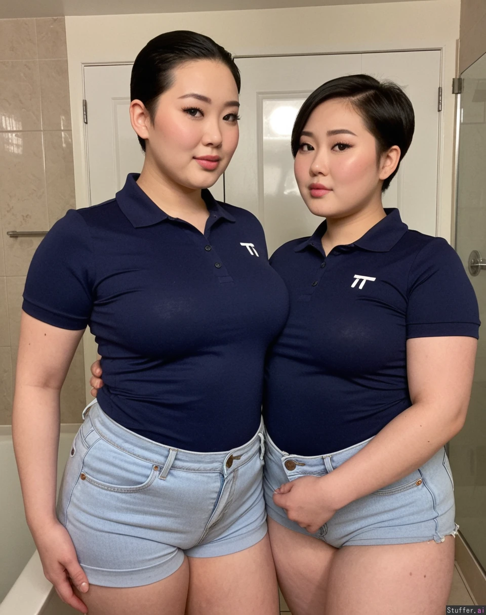 Body: big Korean bitches, pretty face, (plus size supermodels), ((overweight)), ((fat)), pretty, 23, hot stunning face detail, (twins), greased slicked back pixie, dark super short pixie cut, Outfit: ((navy polo top)), (light gray Jean shorts), modest, uniform Pose: inviting, showing off each other , baddest fat bitches, stoic, Location: bathroom, (Two korean plump women filming a hot tiktok), (big fat bitches)