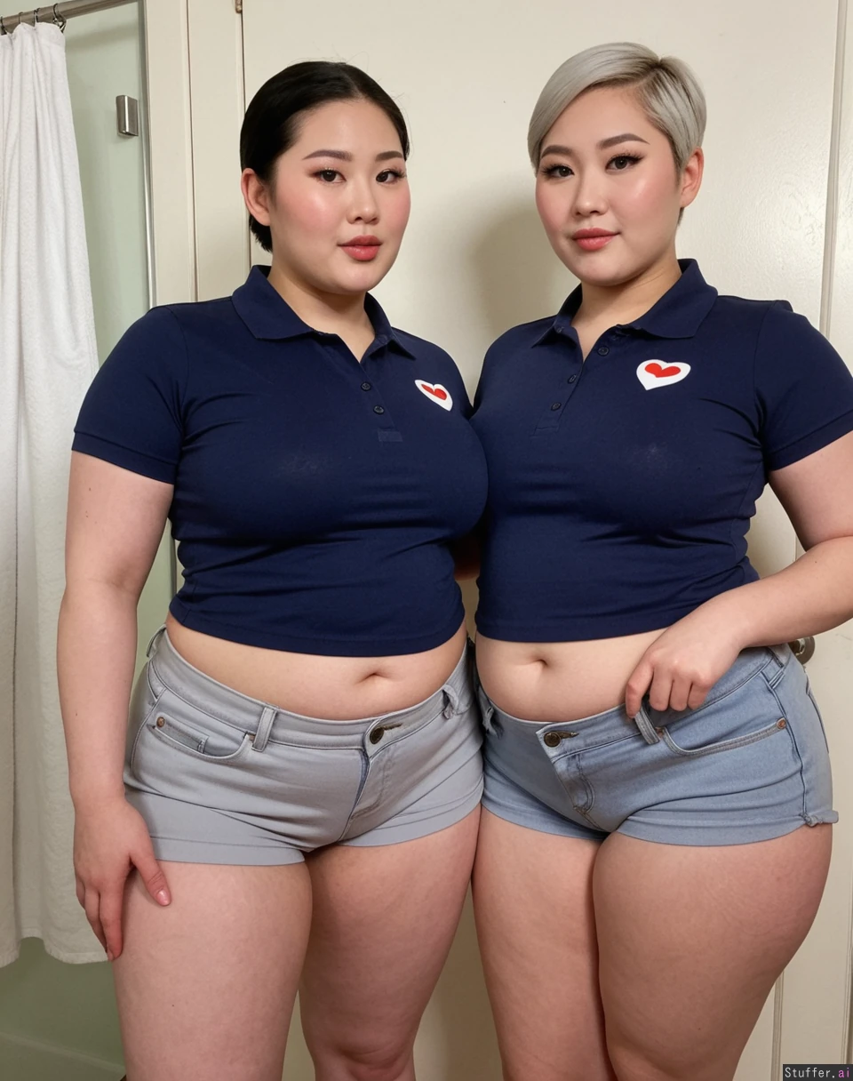 Body: big Korean bbws, pretty face, (plus size supermodels), ((overweight)), ((fat)), pretty, 23, hot stunning face detail, (twins), greased slicked back pixie, dark super short pixie cut, Outfit: ((navy polo top)), (light gray Jean shorts), modest, uniform Pose: inviting, showing off each other , baddest fat bitches, stoic, Location: bathroom, (Two korean bbw women filming a hot tiktok), (big fat bitches)