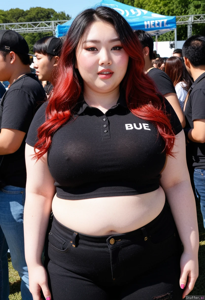 Hyper realistic, ((solo woman)), stunning baddie face detail, raver, pretty 20 year old korean plus size model, wavy dark long hair with red highlights, quirky, very chinky Korean eyes, music festival, sunny day, ((front view)), excited, having fun, (Black mid waist work jeans), (Plain black cropped polo), ((Wide hips)), fat, female , thighs, perfect overweight plus size body, very body positive, sharp defined face,
