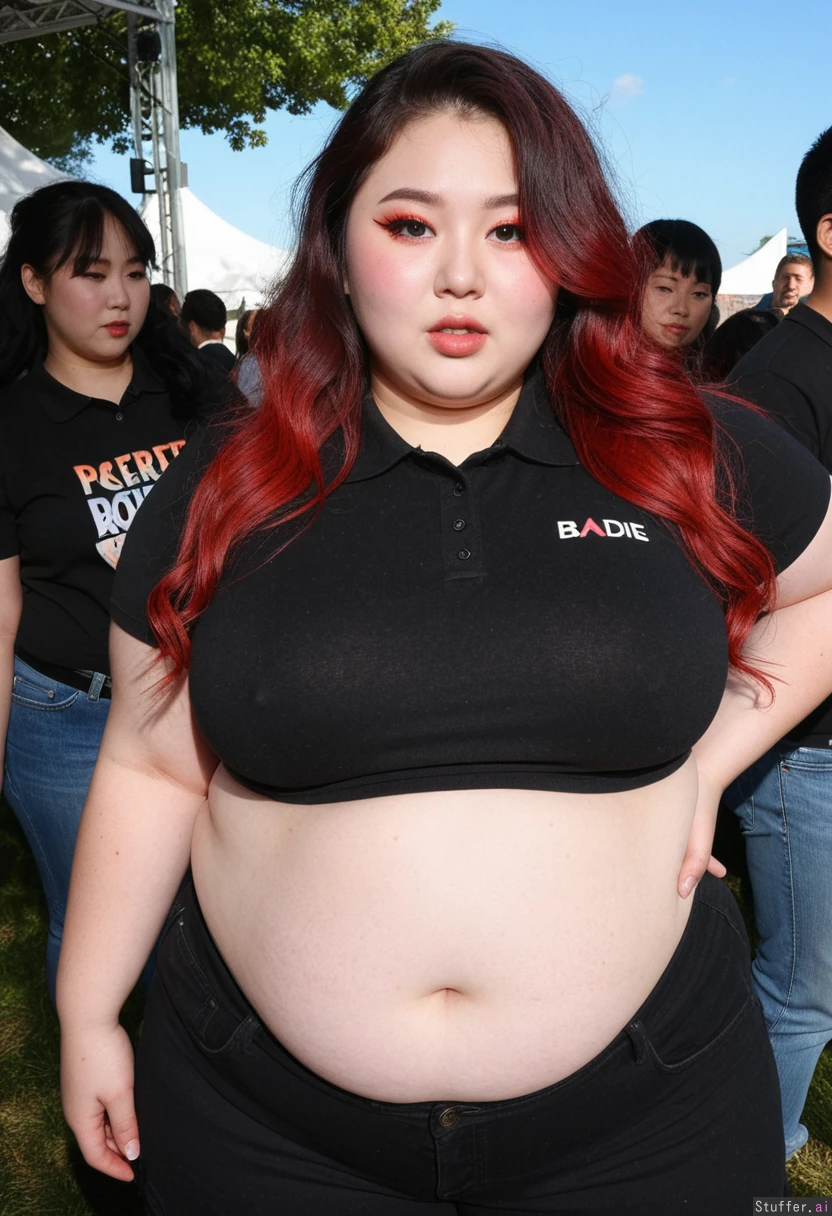 Hyper realistic, ((solo woman)), stunning baddie face detail, raver, pretty 20 year old korean plus size model, wavy dark long hair with red highlights, quirky, very chinky Korean eyes, music festival, sunny day, ((front view)), excited, having fun, (Black mid waist work jeans), (Plain black cropped polo), ((Wide hips)), fat, female , thighs, perfect overweight plus size body, very body positive, sharp defined face,