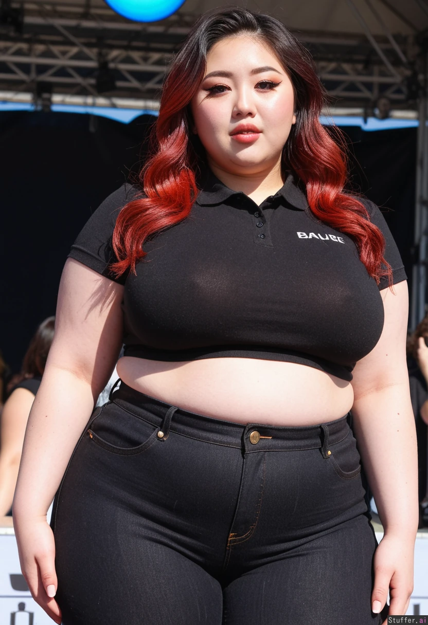 Hyper realistic, ((solo woman)), stunning baddie face detail, raver, pretty 20 year old korean plus size model, wavy dark long hair with red highlights, quirky, very chinky Korean eyes, music festival, sunny day, ((front view)), excited, having fun, (Black mid waist work jeans), (Plain black cropped polo), ((Wide hips)), fat, female , thighs, perfect overweight plus size body, very body positive, sharp defined face,
