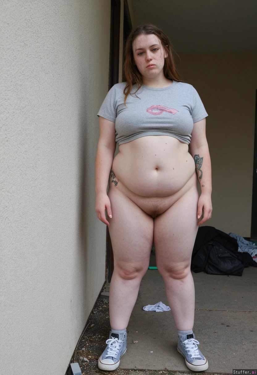 Homeless 22 years old skinny drug addict woman. Extreme acne. Wearing tatty clothes. Standing full body shot. Hyper wide hips. Massive thighs