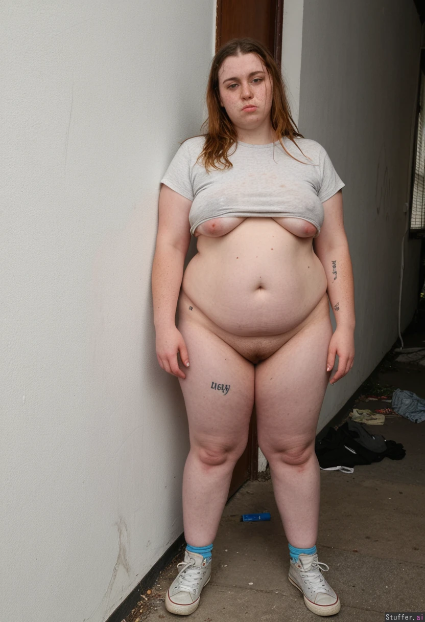 Homeless 22 years old skinny drug addict woman. Extreme acne. Wearing tatty clothes. Standing full body shot. Hyper huge wide hips.