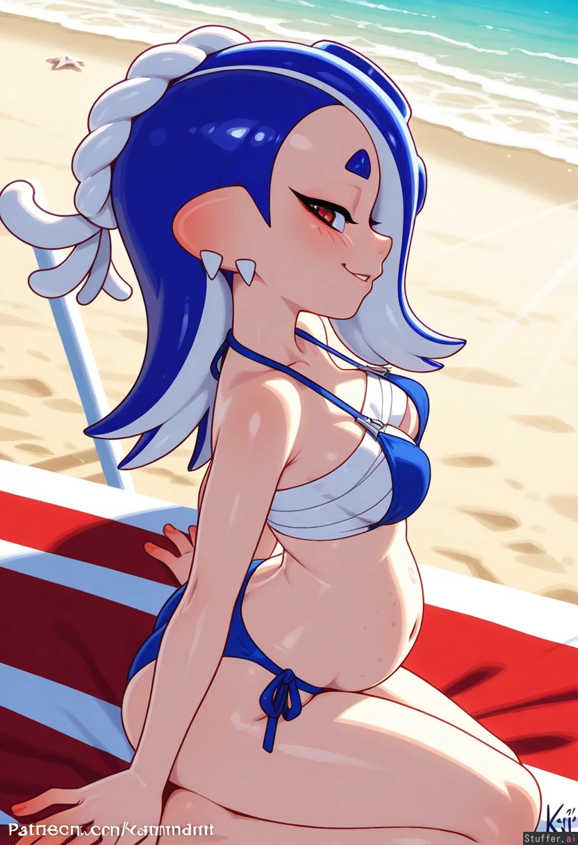 best_quality, high_rating, kajin_(kajinman), wamudraws(artist), shiver_(splatoon), beach, (round_belly:1.5), white_chest_sarashi, solo, (red_fingers:1.3), blue_bikini_bottom, perky_breasts, smile, on_all_fours, on_knees, (side_view:1.4), profile