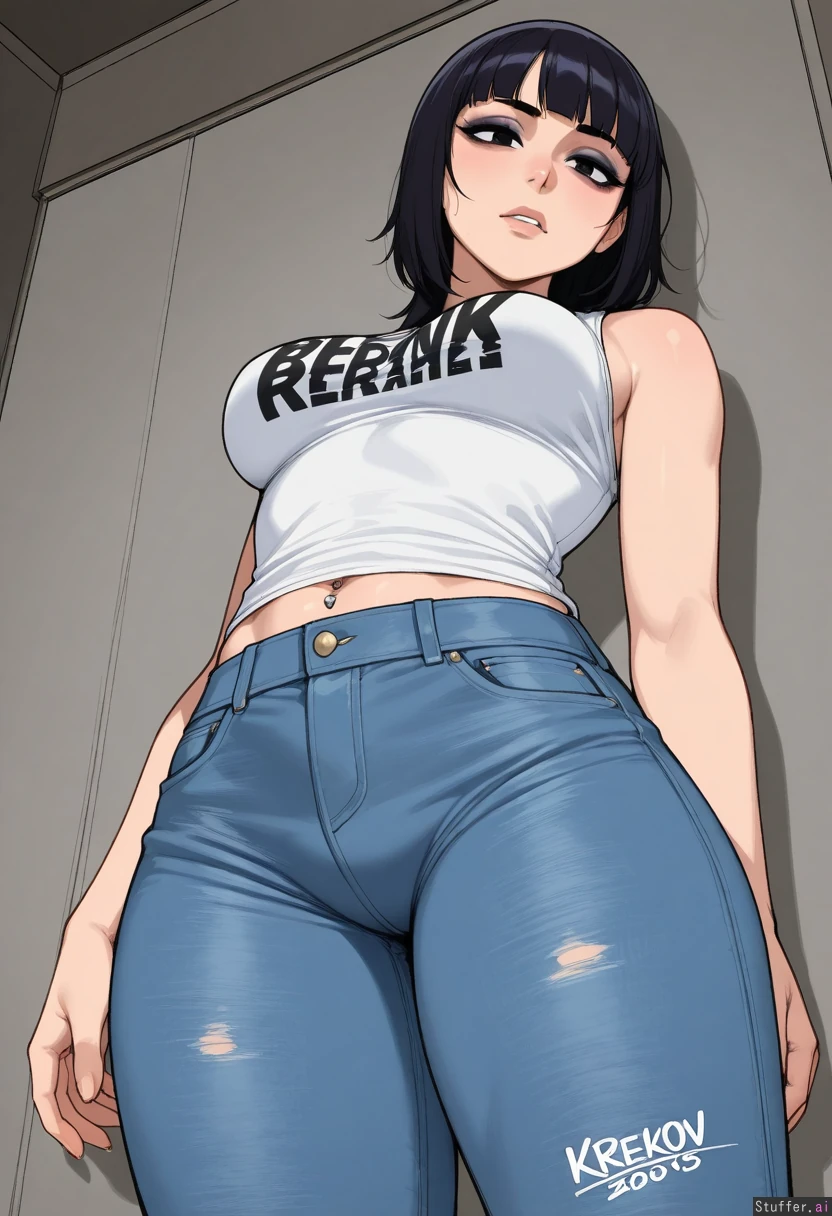 (dark hair, bangs), dark eyes, white tank top, solo, ((high quality, high detail)), KAMII MOMORU(artist), bleach (art style), medium breasts, krekkov(artist), (detailed face), (tired eyes, eyeliner), ((punk)), (skinny jeans, navel piercing, low rise jeans), (((bottom heavy, chubby tummy, muffintop, wide hips:0.9))), (((midriff peek))), (dramatic angle, thong showing)