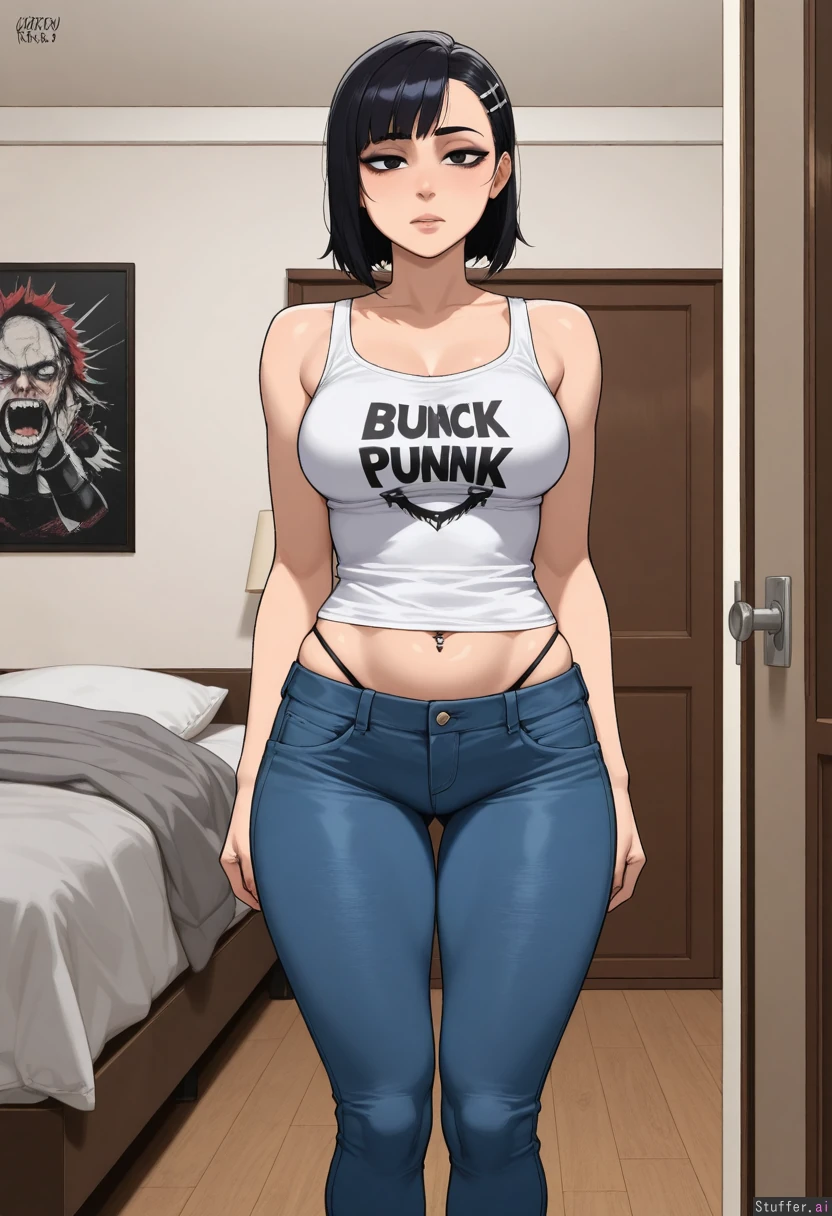 (dark hair, bangs), dark eyes, white tank top, solo, ((high quality, high detail)), KAMII MOMORU(artist), bleach (art style), medium breasts, krekkov(artist), (detailed face), (tired eyes, eyeliner), ((punk)), (skinny jeans, navel piercing, low rise jeans), (((bottom heavy, chubby tummy, muffintop, wide hips:0.9))), (((midriff peek))), (looking at viewer, thong showing), standing in bedroom, ((thick thighs:0.1, wide hips:0.1, chubby:0.1))