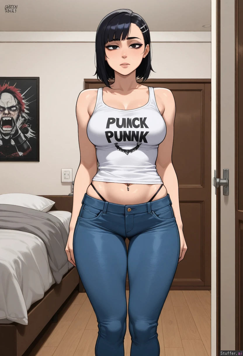 (dark hair, bangs), dark eyes, white tank top, solo, ((high quality, high detail)), KAMII MOMORU(artist), bleach (art style), medium breasts, krekkov(artist), (detailed face), (tired eyes, eyeliner), ((punk)), (skinny jeans, navel piercing, low rise jeans), (((bottom heavy, chubby tummy, muffintop, wide hips:0.9))), (((midriff peek))), (looking at viewer, thong showing), standing in bedroom, ((thick thighs:0.2, wide hips:0.2, chubby:0.2))