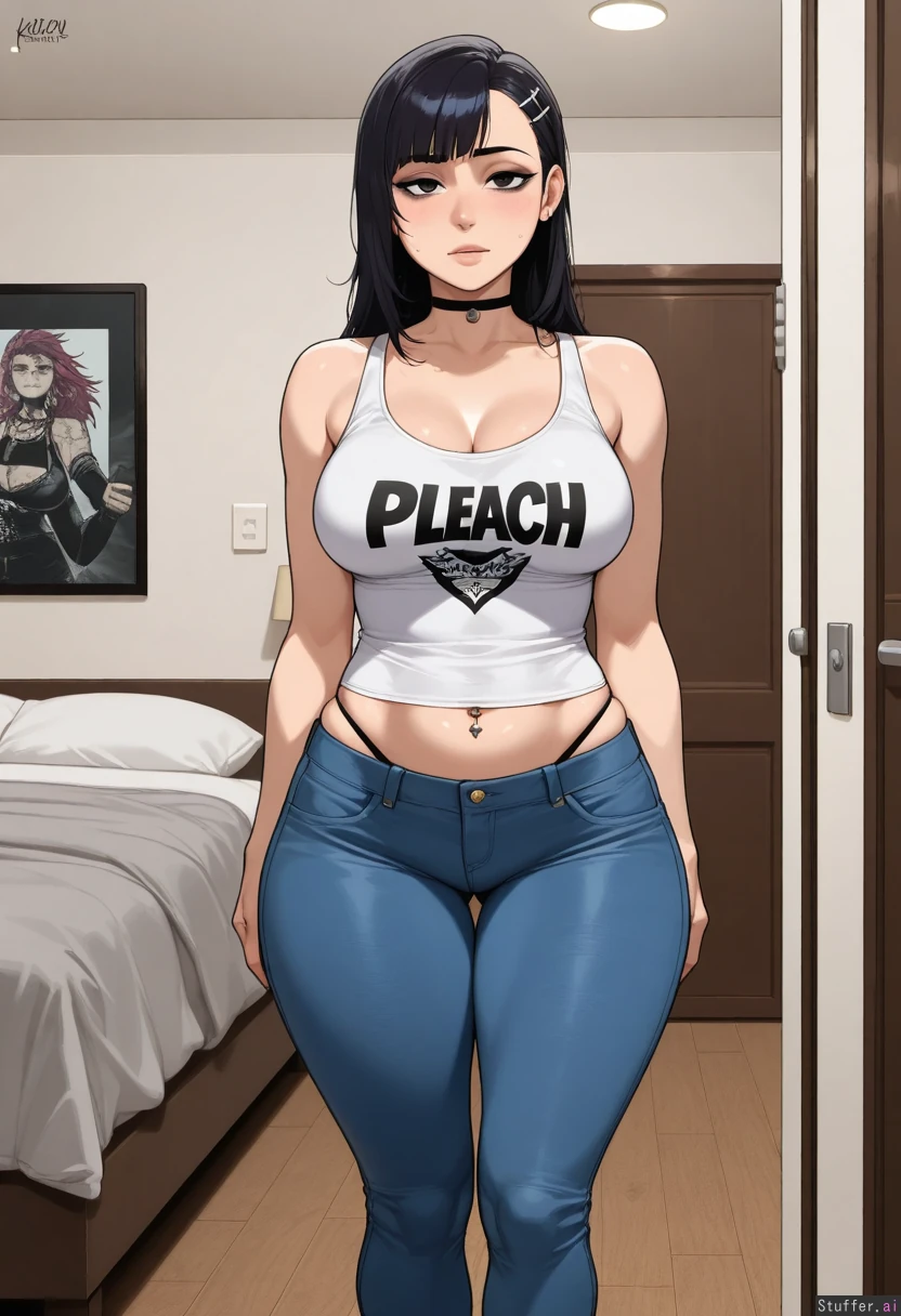 (dark hair, bangs), dark eyes, white tank top, solo, ((high quality, high detail)), KAMII MOMORU(artist), bleach (art style), medium breasts, krekkov(artist), (detailed face), (tired eyes, eyeliner), ((punk)), (tight jeans, navel piercing, low rise jeans), (((bottom heavy, chubby tummy, muffintop, wide hips:0.9))), (((midriff peek))), (looking at viewer, thong showing), standing in bedroom, ((thick thighs:0.6, wide hips:0.6, chubby:0.6))