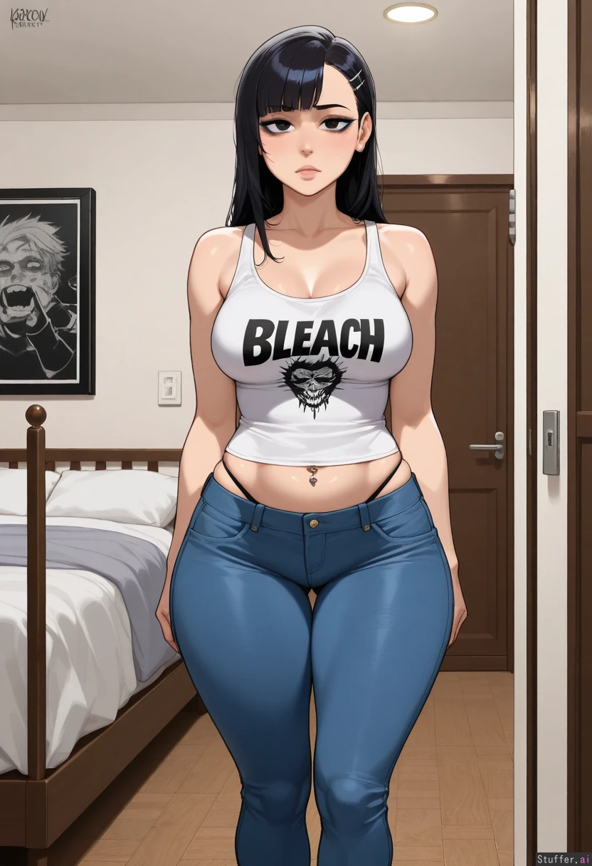 (dark hair, bangs), dark eyes, white tank top, solo, ((high quality, high detail)), KAMII MOMORU(artist), bleach (art style), medium breasts, krekkov(artist), (detailed face), (tired eyes, eyeliner), ((punk)), (tight jeans, navel piercing, low rise jeans), (((bottom heavy, chubby tummy, muffintop, wide hips:0.9))), (((midriff peek))), (looking at viewer, thong showing), standing in bedroom, ((thick thighs:0.7, wide hips:0.7, chubby:0.7))