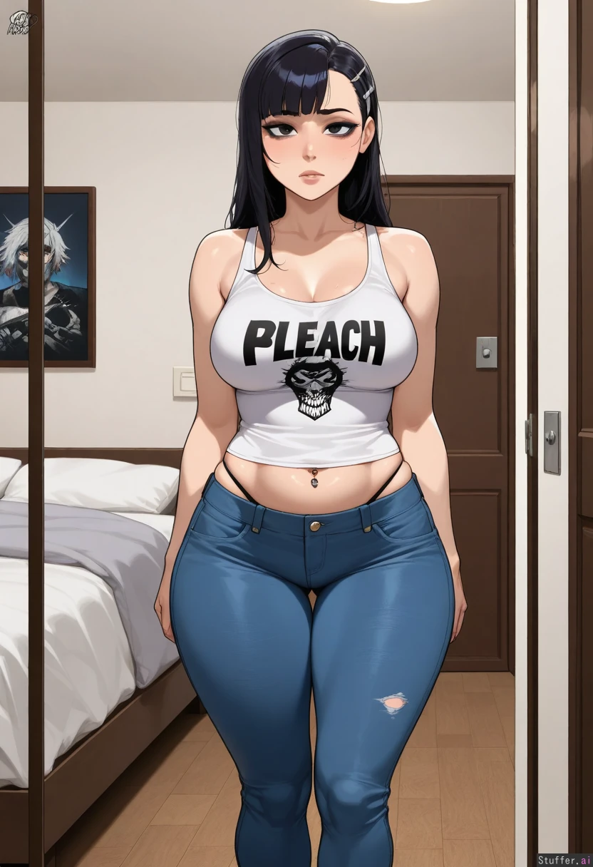(dark hair, bangs), dark eyes, white tank top, solo, ((high quality, high detail)), KAMII MOMORU(artist), bleach (art style), medium breasts, krekkov(artist), (detailed face), (tired eyes, eyeliner), ((punk)), (tight jeans, navel piercing, low rise jeans), (((bottom heavy, chubby tummy, muffintop, wide hips:0.9))), (((midriff peek))), (looking at viewer, thong showing), standing in bedroom, ((thick thighs:0.8, wide hips:0.8, chubby:0.8))