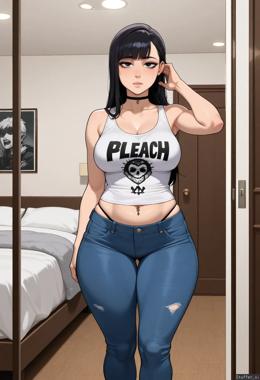 (dark hair, bangs), dark eyes, white tank top, solo, ((high quality, high detail)), KAMII MOMORU(artist), bleach (art style), medium breasts, krekkov(artist), (detailed face), (tired eyes, eyeliner), ((punk)), (tight jeans, navel piercing, low rise jeans), (((bottom heavy, chubby tummy, muffintop, wide hips:0.9))), (((midriff peek))), (looking at viewer, thong showing), standing in bedroom, ((thick thighs:0.9 wide hips:0.9 chubby:0.9))
