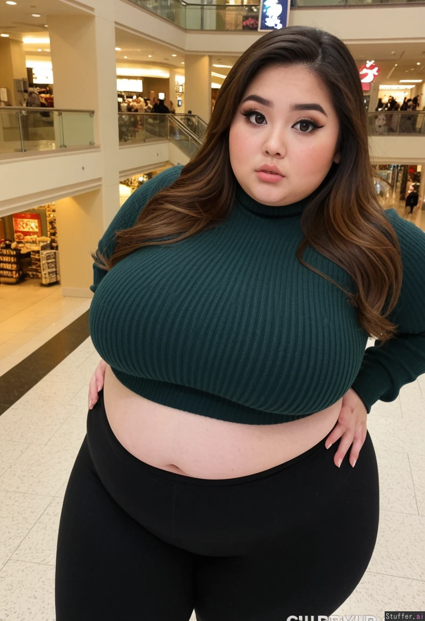 (((above view), 21 year old asian woman, large eyes)), (perfect model face), (dark eyeliner, heavy blush), ((black leggings, dark green sweater, thick voluminous brown hair)), obese (((extreme huge wide hips, chubby midriff exposed))), ((huge chubby thick sexy body)), mall setting, standing, perfect hands, hands on hips