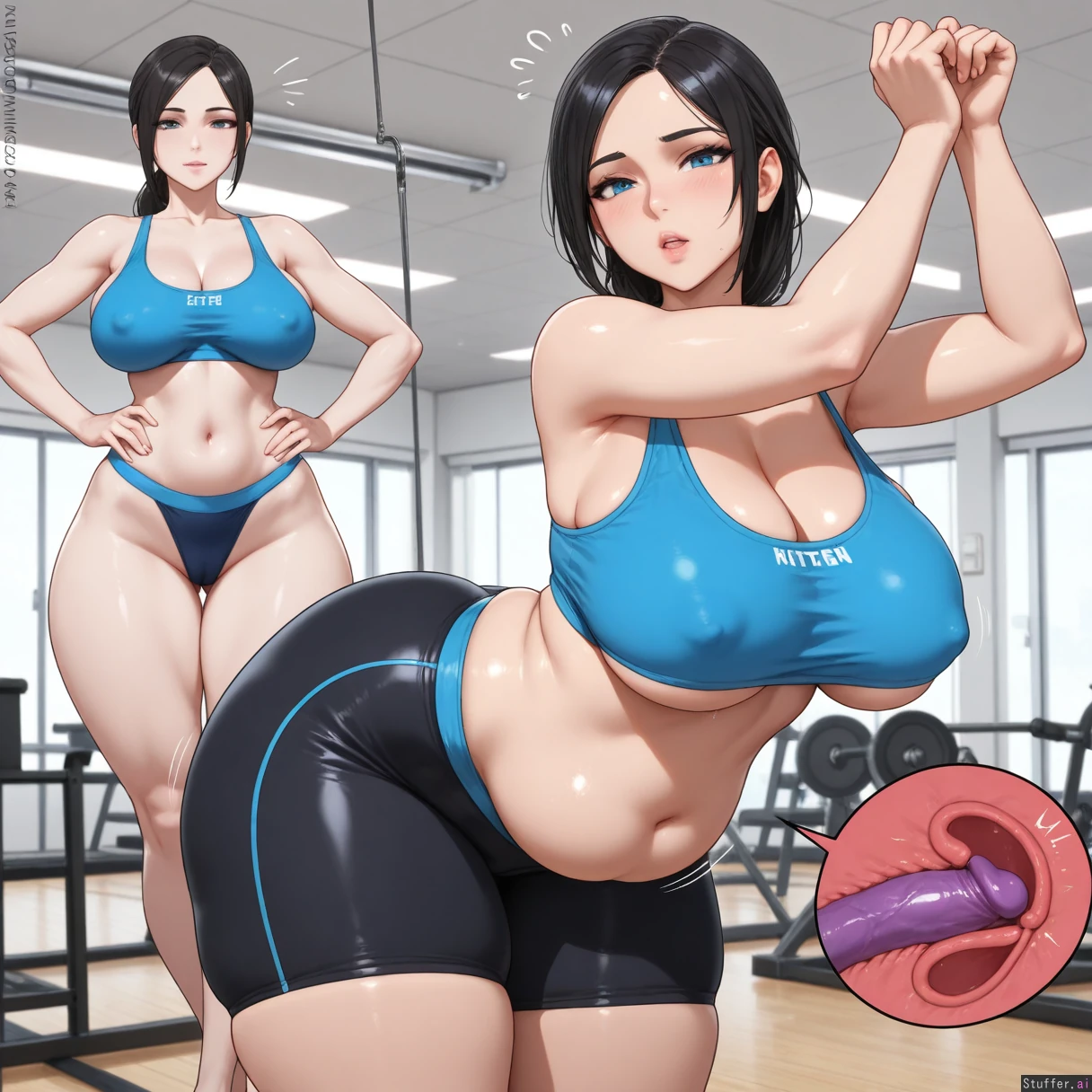 (46000k high resolution, 8k, 4k, UHD, 1080p high resolution, HDR, highres, absurd_res, adaptability_res, ultra_quality, hyper detail, highly detailed, intricate detail, realistic background, lighting_ambient, (masterpiece_quality, intricate texture detail, high image clarity, sharp image focus, vivid, realistic), detailed textures, expressive, definition lines, soft colors, full color, extremely photorealistic, realistic lighting, highly detailed face, beautiful face, highly detailed eyes, extremely realistic skin, gorgeous, majestic, cute, highly detailed background, extremely detailed eyes, skindentation, perfect anatomy, slim face, slender arms, extremely accurate hands, extremely detailed hands, perfect skin:1.4, clearly distinct bodyparts, perfect features, no mistakes), (Hentai:1.3, anime:1.2, ecchi:1.2), (c.cu\(artist\):1.2), (kipteitei\(artist\):1.2), (spellsX\(artist\):1.2), (Kittew\(artist\):1.3), (betterwithsalt\(artist):1.2), (Casualobsessive\(artist\):1.2), (Icarusillustrations\(artist\):1.1), (doveymouse\(artist\):1.2), (coffeeslice\(artist\):1.1), (blushyspicy\(artist\)), (bambooale\(artist\)), (thiccwithaq\(artist\):1.1), (shexyo\(artist\):1.2), (cutesexyrobutts\(artist\):1.1), (Mmmlia\(artist\:1.2)), (watercolor(medium)), (((perfect anatomy))), (((correct anatomy))), (((ultra realistic))), ((photorealistic)), (((intense shading))), (Sciamano240\(artist\)), 1woman(feedee), ((sweat, oiled skin, shiny skin)), tall, thick, (plump lips: 1.4), ((bloated belly:1.3)), (protruding lower belly:1.6), incredibly wide belly:1.3, huge wide waist:1.3), ( 1 girl, (((wii fit trainer:1.3, extremely pale white skintone:1.3, black hair, bangs))), hair up in a ponytail, blue eyes, (slimthick:1.2), ((yoga outfit:1.3, black yogapants with blue waistband:1.3, blue spandex sports croptop:1.3, incredibly undersized clothes:1.3)), slender arms, slender hands, (long_legs:1.5), (slender athletic body, thick round blubbery fat belly_rolls:1.4, fat belly flab:1.4), hard nipples:1.2, visible nipple imprint in fabric:1.4, belly uncovered:1.4, exposed belly:1.4, highly sexual:1.4, hyper lewd:1.4, Huge round heavily sagging hips:1.5, Huge round heavily sagging lower_thighs:1.4, huge round heavily sagging butt cheeks:1.4, large round sagging lower belly blending into thighs:1.4, huge round sagging fupa:1.3, (huge overloaded belly stuffed tight in round extremely heavy sagging gut sticking out prominently:1.4, ((round midsection prominently bulging out extremely wide hanging over hips:1.4))), ), ((Tight shallow belly button, shallow navel:1.1, low navel)), (((((Medium round natural boobs:1.3, thick round thighs:1.3, narrow hips:1.3, phat ass:1.3))))), (muffin top) ), (((Hyper massively morbidly obese:1.4))) (((Hardcore dildo masturbation))) ((slouching:1.3, shoulders slumped:1.3, arched back:1.3)), ((blush:1.0)), ((Gentle motion lines to suggest natural movement)), (((Dazed nauseous overfed expression:1.3, nervous uncertain expression:1.3, open mouth))), ((ultra detailed background, gym, yoga studio background:1.3), (((looking at viewer in embarrassed shame:1.3, overly shy expression:1.3, standing))),