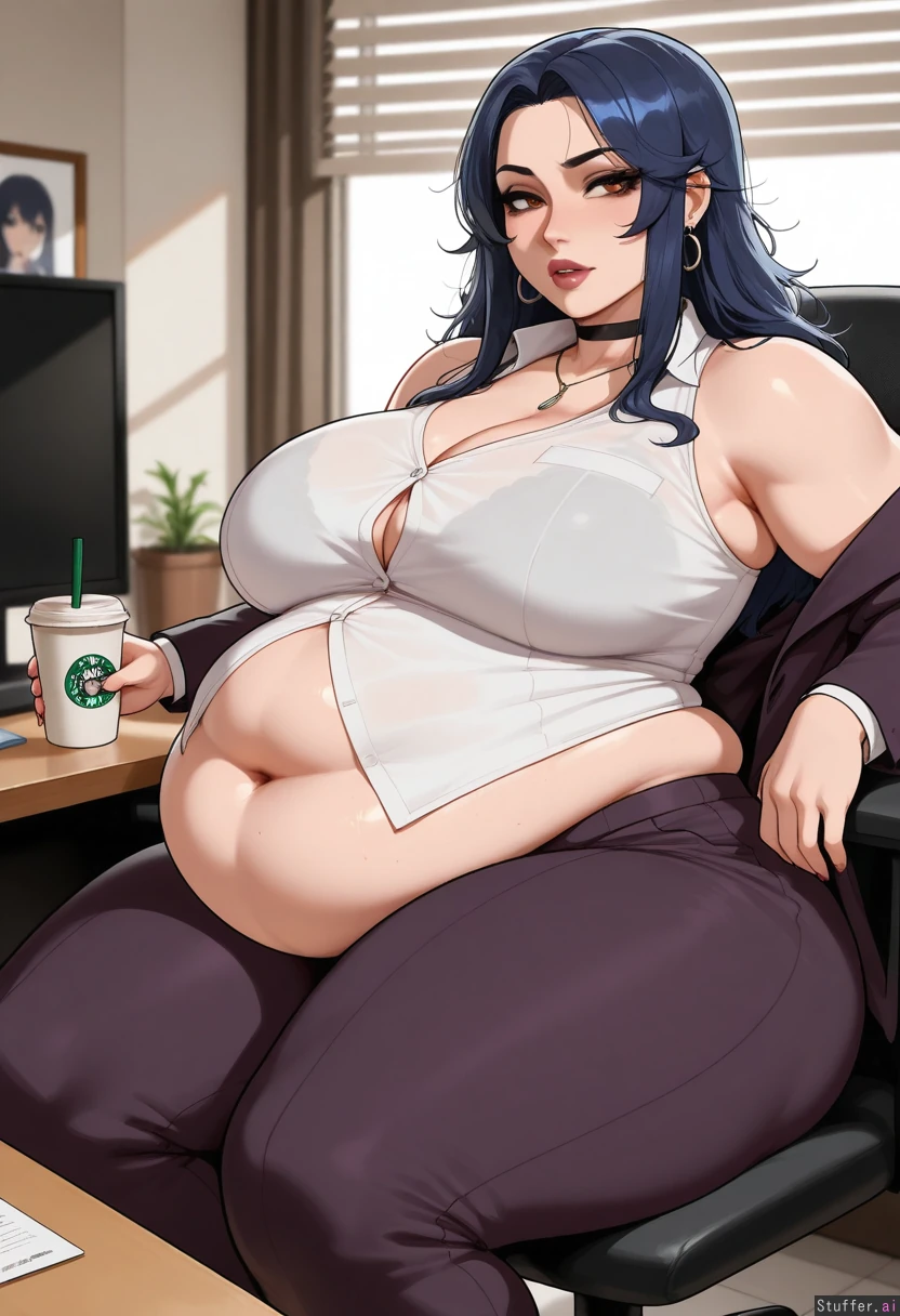 Super high quality, nyantcha(artist), alone, Artist style: ( nyantcha:), ( krekkov), (kittew), solo, soft lighting, facing viewer, Fat, bbw , goth woman , ((long messy dark blue hair)) ((thick black eyeliner)) ((highly detailed Amber eyes)) (long defined lashes, softly arched eyebrows, straight refined nose, full lips, bold dark red lipstick, composed confident expression, slightly parted lips, elegant neck relaxed shoulders, plump face, detailed eyes, wide hips, large fat butt, wide thighs, fat arms, very heavy, ((naked)), ((((gluttonous ussbbw, enormous expanded thighs, enormous jiggly legs, huge plump love handles, hyper wide and obese hips, hyper massive distended belly)))), in her office, ((massive fat fupa, belly engulfing her torso)), ((legs spread by her sagging belly, aroused by her massive growing size, becoming immobilized by her belly, her body is rapidly growing much plumper, obese arms and back)), (((extreme belly expansion))), ((((solo girl, hyper morbidly obese and extremely bloated body, (hyper gigantic swollen overfed belly:1.9))))) formal office attire, fully clothed dark-colored flared pants, white button up , long sleeve blouse , opened blazer, modest clothing, fully clothed, fancy corner office, detailed background, Leaning back stretching in a chair and working at a tidy desk, monitor, beautiful view out of her window, drinking a starbucks coffee, overweight build , (breasts:1.5),
