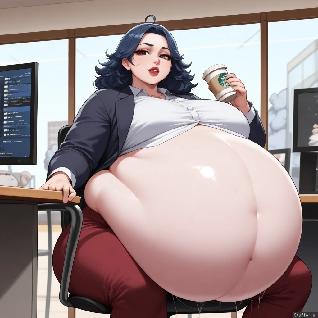 Super high quality, nyantcha(artist), alone, Artist style: ( nyantcha:), ( krekkov), (kittew), solo, soft lighting , facing viewer, Obese, goth woman , ((long messy dark blue hair)) ((thick black eyeliner)) ((highly detailed Amber eyes)) (long defined lashes, softly arched eyebrows, straight refined nose, full lips, bold dark red lipstick, composed confident expression, slightly parted lips, elegant neck relaxed shoulders, plump face, detailed eyes, wide hips, large fat butt, wide thighs, fat arms, very heavy inflated belly (flabby belly hanging: 2.0). (Large Belly size:2.0)( fat doughy flabby double belly:1.8) ((gigantic bloated large fat sagging belly) ((belly resting on thighs:1.5)) ((legs spread by her gut)) formal office attire, dark-colored flared pants, white button up , long sleeve blouse , opened blazer, modest clothing, fully clothed, fancy corner office, detailed background, Sitting stiffly in a chair and working at a tidy desk, monitor, beautiful view out of her window, drinking a starbucks coffee, overweight build , (breasts:1.2)