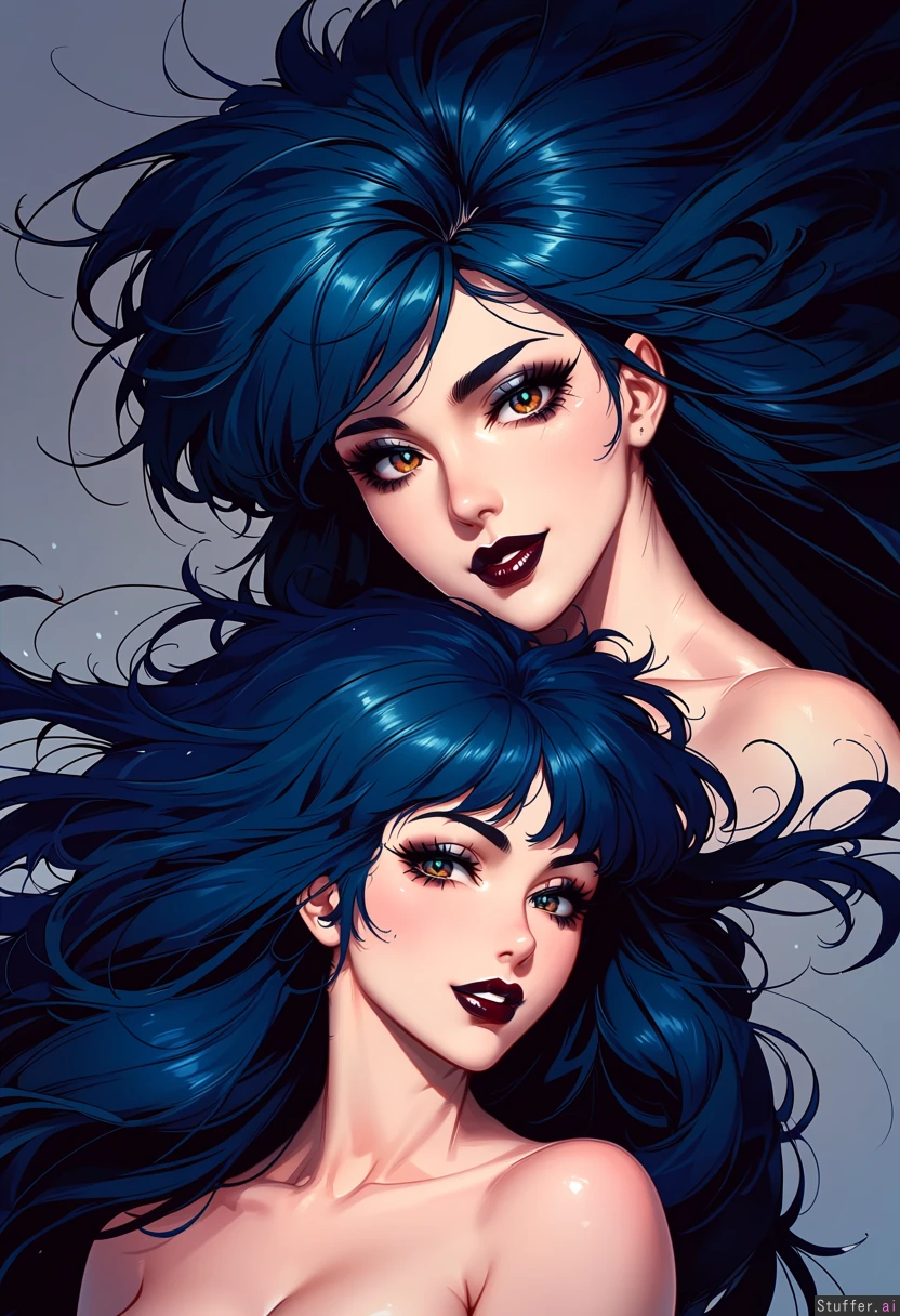Two woman: (1st woman:((Kaname_chidori from full metal panic) , bbw woman, smile, hat, topless.))) (2nd woman: Fat, bbw , goth woman , ((long messy dark blue hair)) ((thick black eyeliner)) ((highly detailed Amber eyes)) (long defined lashes, softly arched eyebrows, straight refined nose, full lips, bold dark red lipstick, composed confident expression, slightly parted lips, elegant neck relaxed shoulders, plump face, detailed eyes, wide hips, large fat butt, wide thighs)