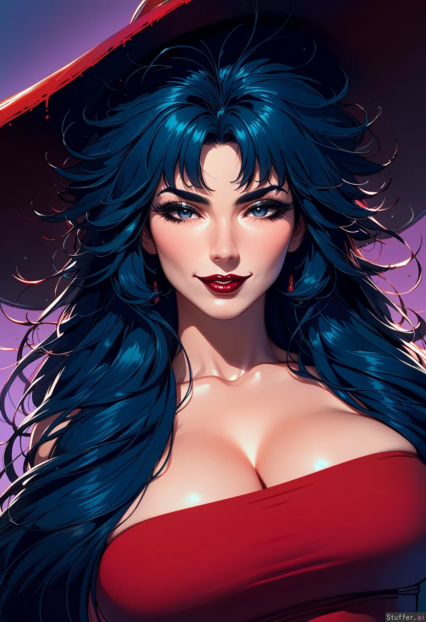 Combine (1st woman:((Kaname_chidori from full metal panic) , bbw woman, smile, hat, topless.))) (2nd woman: Fat, bbw , goth woman , ((long messy dark blue hair)) ((thick black eyeliner)) ((highly detailed Amber eyes)) (long defined lashes, softly arched eyebrows, straight refined nose, full lips, bold dark red lipstick, composed confident expression, slightly parted lips, elegant neck relaxed shoulders, plump face, detailed eyes, wide hips, large fat butt, wide thighs)