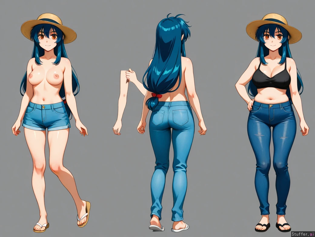 Highly detailed (Kaname_chidori from full metal panic), smile, hat, topless. Blue jeans and pink flip flops ***standing next to*** A fat goth woman with dark blue hair and amber eyes thick black eyeliner