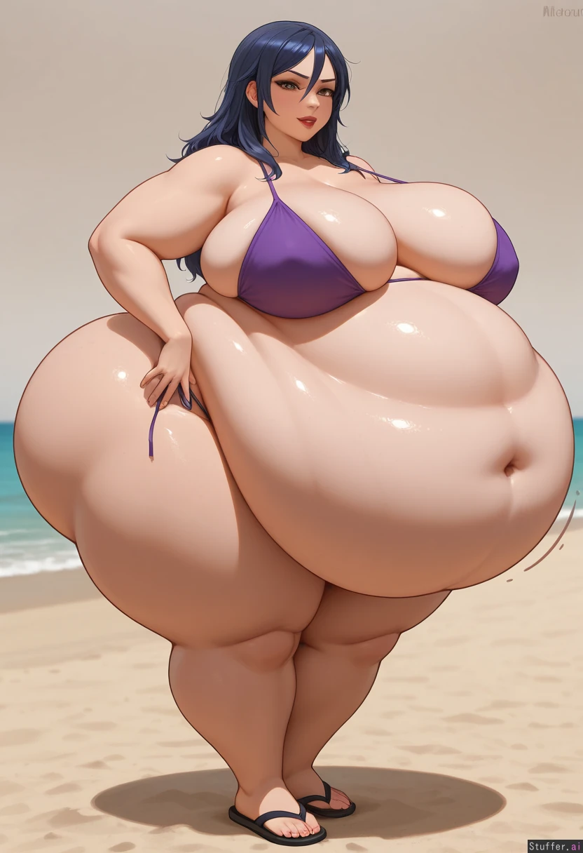 ((photorealistic)), ((Kittew),nancou), 1girl, **facial features** (long messy dark blue hair, hair down ) thick black eyeliner, highly detailed Amber eyes, long defined lashes, softly arched eyebrows, straight refined nose, full lips, bold dark red lipstick, composed confident expression, slightly parted lips, plump face, detailed eyes **clothing** dark_purple_bikini, **body features** ((Large_breasts):1.05), (huge belly:1.5), (spherical belly), (bloated_belly), (((((morbidly_obese, ussbbw))))), , wide hips, large fat butt, wide thighs, black flip flops **actions and pose** Standing_on_sand_beach, posing_at_bikini_contest, seductive_pose, **angle and location** Outdoors, Sand_beach, sideview