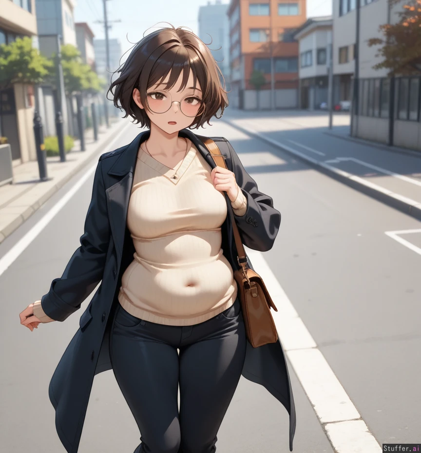 1girl, solo, masterpiece, best quality, best anatomy, cool colors, student, Adult, Brown short hair, brown eyes, medium breasts, skinny, skinny thighs, tall, (chubby belly: 1.1), messy hair, Black coat, baggy sweater, beige sweater, necklace, black pants ,buttoned pants, round glasses, belly bursting out of clothes, brown backpack, Sleepy, shocked, panicked, opened mouth, wide opened eyes, Running Street, day,