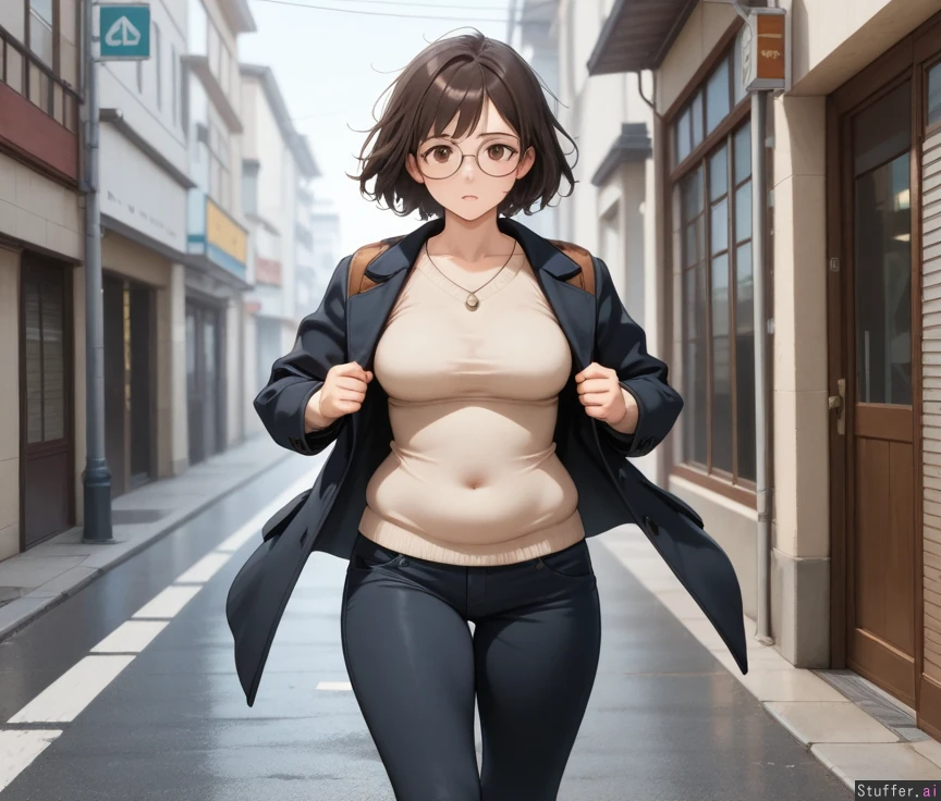 1girl, solo, masterpiece, best quality, best anatomy, cool colors, student, Adult, Brown short hair, brown eyes, medium breasts, skinny, skinny thighs, tall, (chubby belly: 1), messy hair, Black coat, baggy sweater, beige sweater, necklace, black pants ,buttoned pants, round glasses, belly bursting out of clothes, brown backpack, Panicked, Running, Street, day,