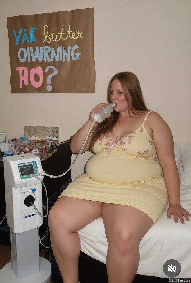 Have her sitting on a bed drinking from a tube connected to a weight gain machine Huge_Weight_gain chubby_woman wide_hips plump_belly fat_arms chubby_face tight_dress