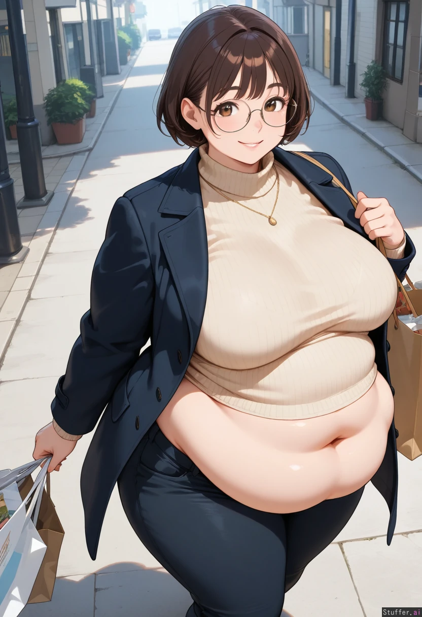 1girl, solo, masterpiece, best quality, best anatomy, cool colors, student, Adult, Brown short hair, brown eyes, (big breasts: 0.5), chubby, thick thighs, tall, (chubby belly: 1.4), (chubby face: 0.3), soft belly, fat rolls, belly bulges, Tight sweater, black coat, beige sweater, necklace, black pants ,buttoned pants, round glasses, belly bursting out of clothes, Happy, smiling, Walking, holding shopping bags, Street, day, view from above