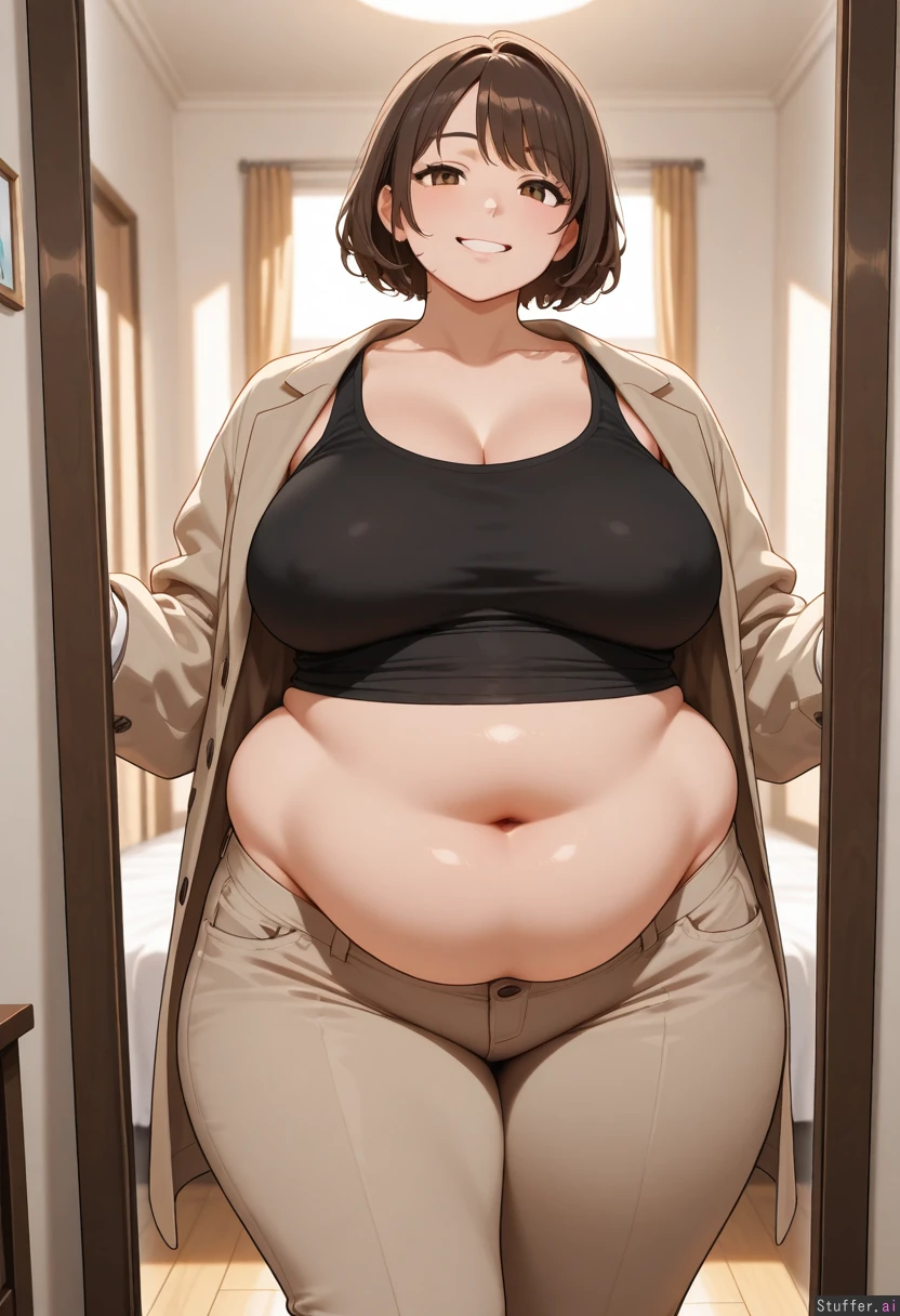 1girl, solo, masterpiece, best quality, best anatomy, cool colors, student, Adult, Brown short hair, brown eyes, (big breasts: 0.5), chubby, thick thighs, tall, (chubby belly: 1.4), (chubby face: 0.3), soft belly, fat rolls, belly bulges, Black tank top, beige buttoned pants, oversized clothes, light brown jacket on arms, Happy, smiling, Standing in front of mirror, Bedroom, evening,