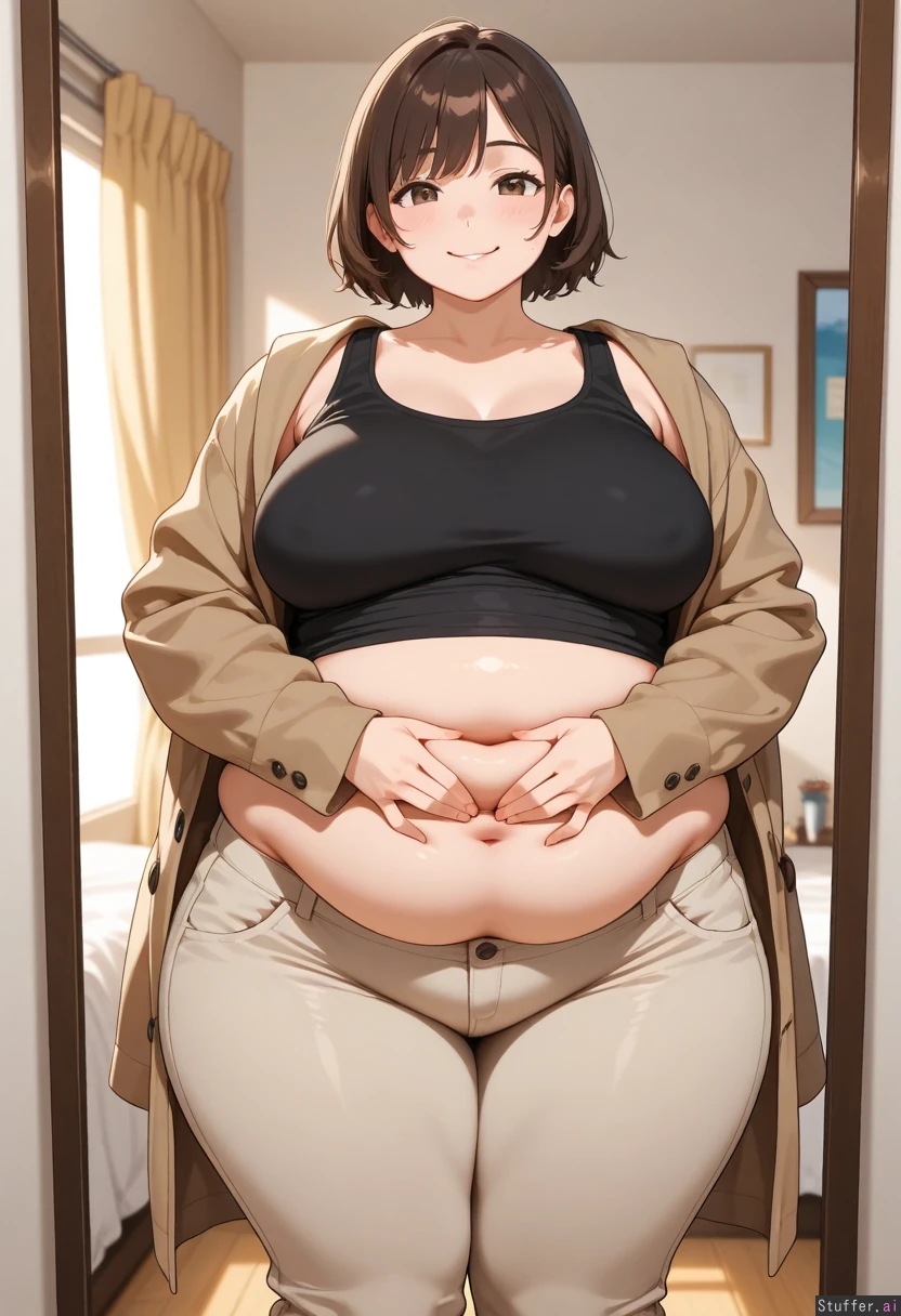 1girl, solo, masterpiece, best quality, best anatomy, cool colors, student, Adult, Brown short hair, brown eyes, (big breasts: 0.5), chubby, thick thighs, tall, (chubby belly: 1.4), (chubby face: 0.3), soft belly, fat rolls, belly bulges, Black tank top, beige buttoned pants, oversized clothes, brown jacket on arms, pants over belly, pants covering belly, Happy, smiling, Standing in front of mirror, Bedroom, evening,