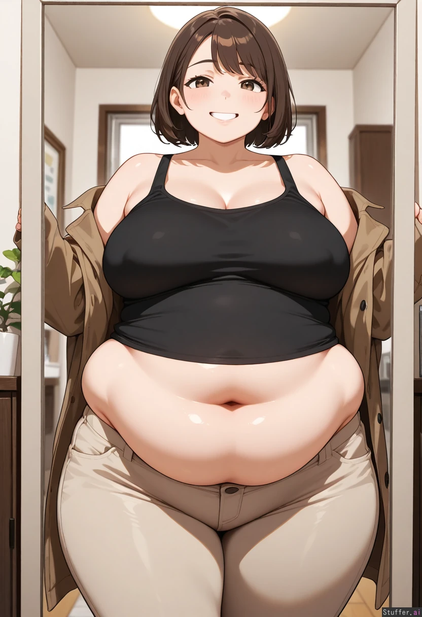 1girl, solo, masterpiece, best quality, best anatomy, cool colors, student, Adult, Brown short hair, brown eyes, (big breasts: 0.5), chubby, thick thighs, tall, (chubby belly: 1.4), (chubby face: 0.3), soft belly, fat rolls, belly bulges, Black tank top, beige buttoned pants, oversized clothes, brown jacket on arms, pants over belly, pants on belly, belly under pants, Happy, smiling, Standing in front of mirror, Bedroom, evening,