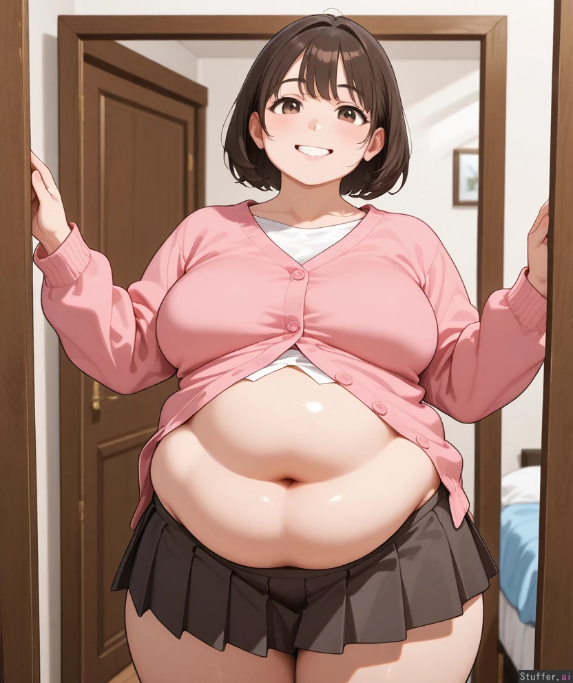 1girl, solo, masterpiece, best quality, best anatomy, cool colors, student, Adult, Brown short hair, brown eyes, (big breasts: 0.5), chubby, thick thighs, tall, (chubby belly: 1.4), (chubby face: 0.3), soft belly, fat rolls, belly bulges, White longsleeve, skirt, pink cardigan, Happy, smiling, Standing in front of mirror, Bedroom, evening,