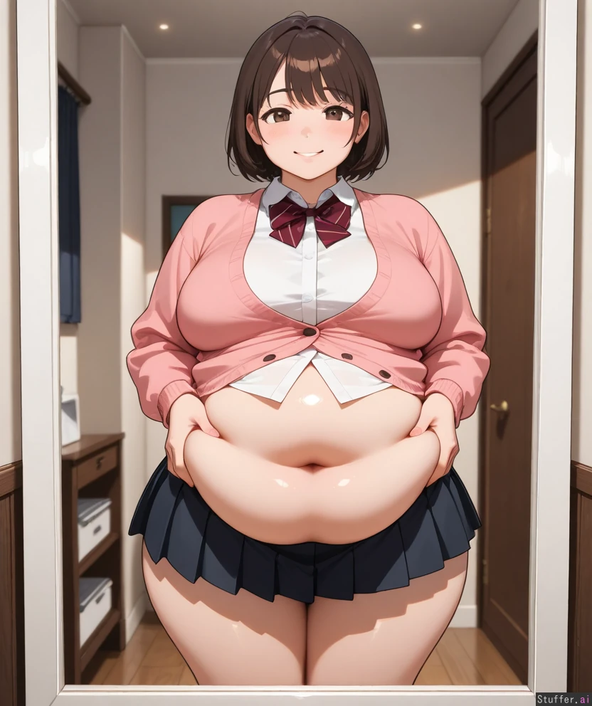 1girl, solo, masterpiece, best quality, best anatomy, cool colors, student, Adult, Brown short hair, brown eyes, (big breasts: 0.5), chubby, thick thighs, tall, (chubby belly: 1.4), (chubby face: 0.3), soft belly, fat rolls, belly bulges, White longsleeve, skirt, pink unbuttoned cardigan, Happy, smiling, Standing in front of mirror, Bedroom, evening,