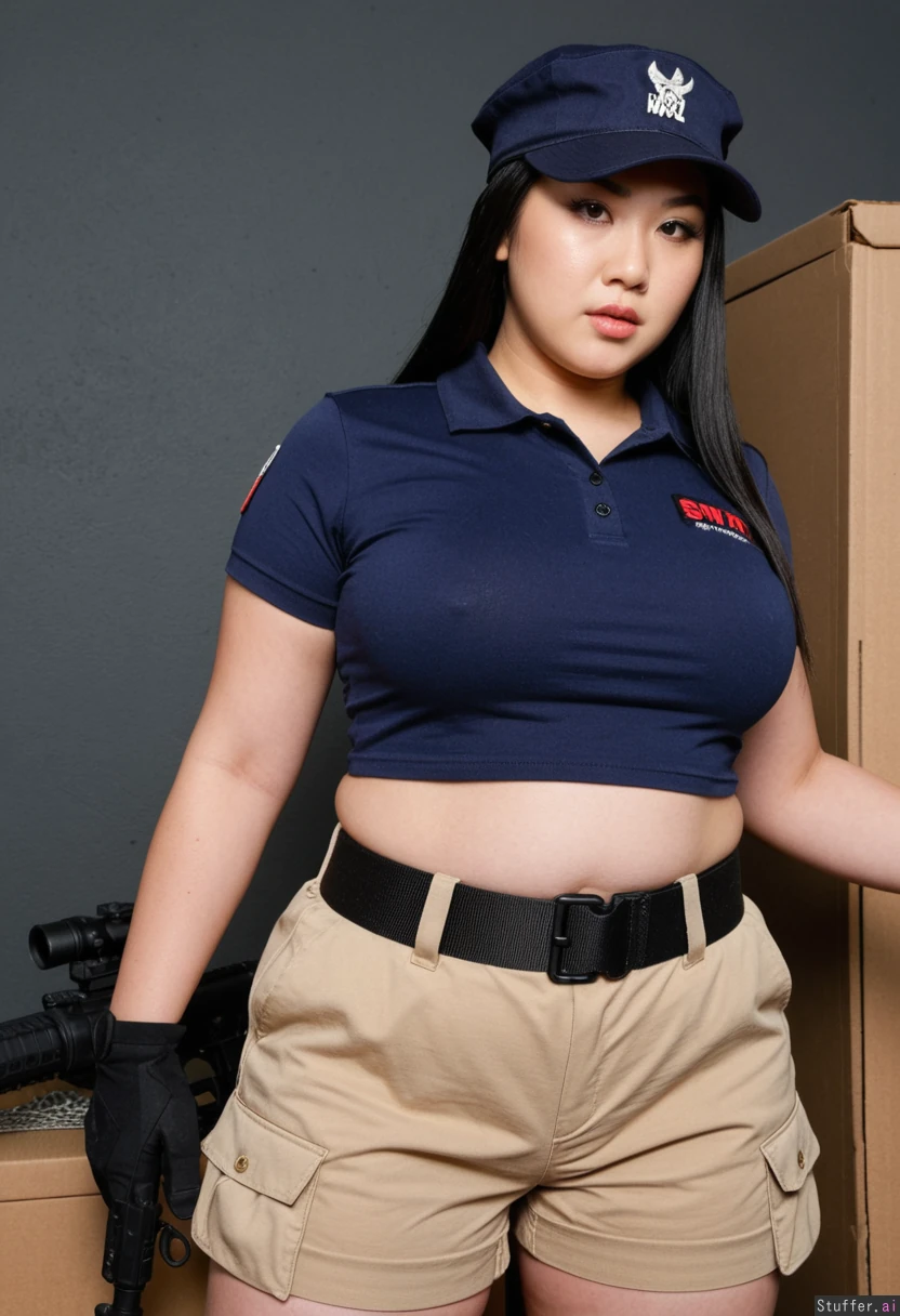 absurd res, 8k, perfect anatomy, masterpiece, 19 year old chinese woman, badass tactical swat agent, beautiful chinky chinese face , beautiful small chinese eyes ,bbw, cute straight black hair, very chinese plus size supermodel, (tight navy polo crop top), tactical gear, (beige cargo_shorts), thicc fat, black cap, SWAT special forces spy, badass swat agent , plus size, (tactical thigh belt), cargo dock,