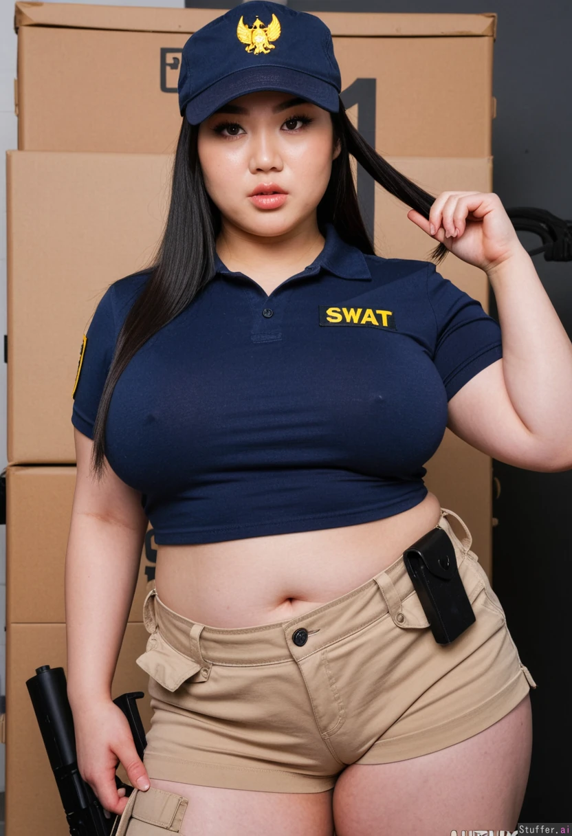 absurd res, 8k, perfect anatomy, masterpiece, 19 year old chinese woman, badass tactical swat agent, beautiful chinky chinese face , beautiful small chinese eyes ,bbw, cute straight black hair, very chinese plus size supermodel, (tight navy polo crop top),( tactical swat gear), (beige cargo_shorts), thicc fat, black cap, SWAT special forces spy, badass swat agent , plus size, (tactical thigh belt), cargo dock,