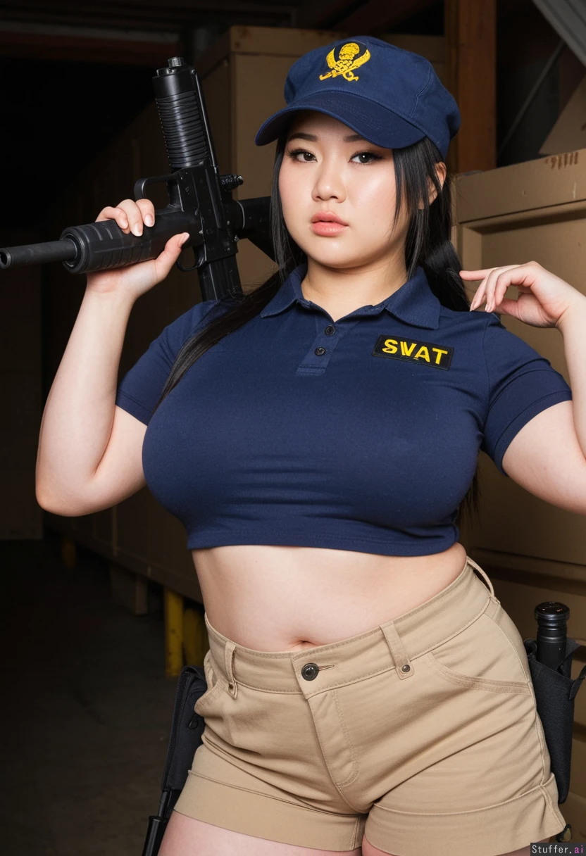 absurd res, 8k, perfect anatomy, masterpiece, 19 year old chinese woman, badass tactical swat agent, beautiful chinky chinese face , beautiful small chinese eyes ,bbw, cute straight black hair, very chinese plus size supermodel, (tight navy polo crop top),( tactical swat gear), (beige cargo_shorts), thicc fat, black cap, SWAT special forces spy, badass swat agent , plus size, (tactical thigh holster), cargo dock,