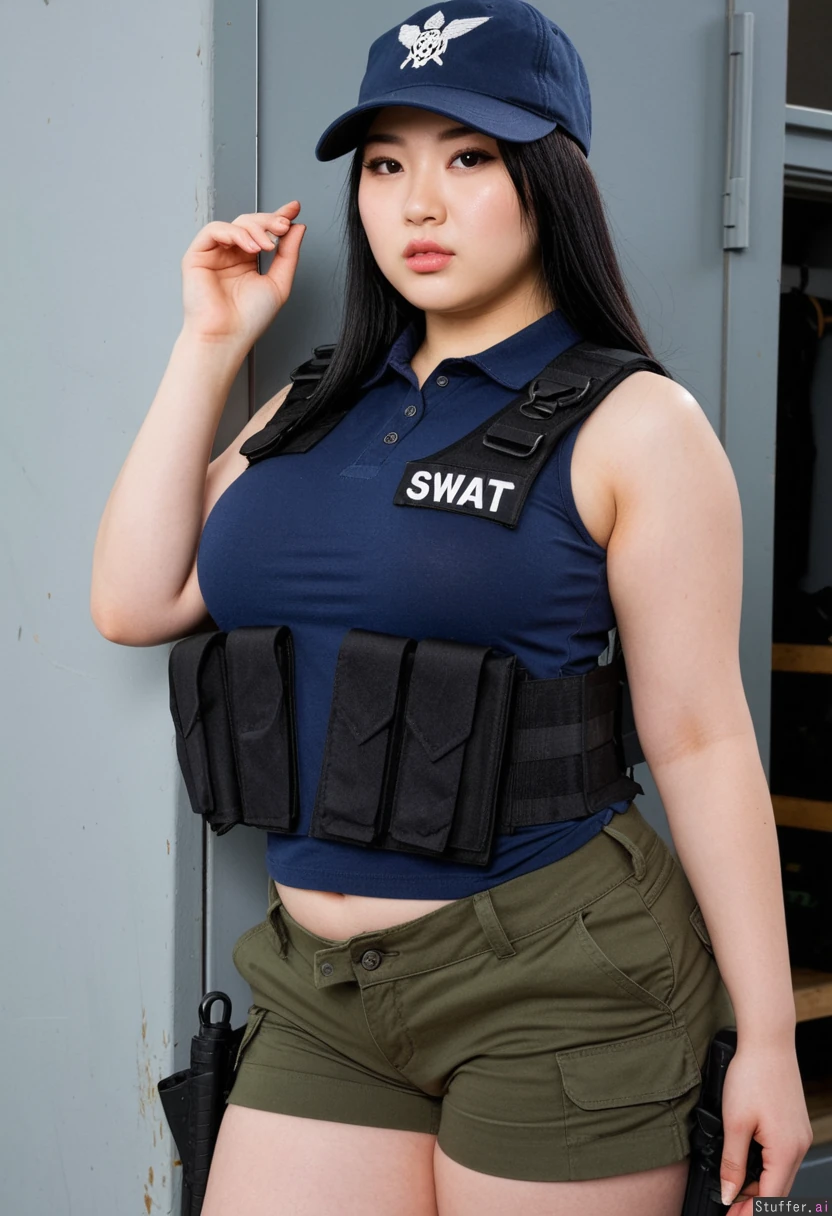 absurd res, 8k, perfect anatomy, masterpiece, 19 year old chinese woman, badass tactical swat agent, ,((tactical swat vest)), beautiful chinky chinese face , beautiful small chinese eyes ,bbw, cute straight black hair, very chinese plus size supermodel, (tight navy polo top), (green cargo_shorts), thicc fat, black cap, SWAT special forces spy, badass swat agent , plus size, cargo dock, seductive face