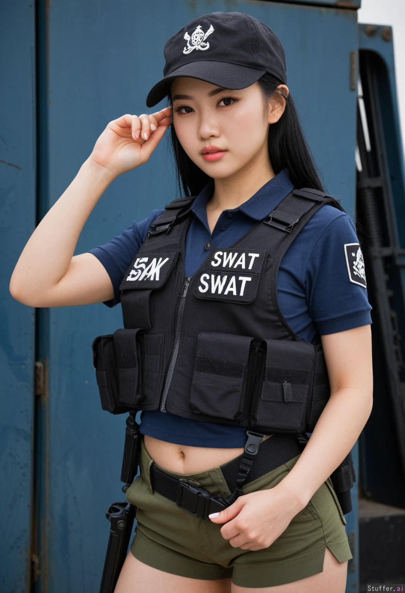 absurd res, 8k, perfect anatomy, masterpiece, 19 year old chinese woman, stunning pretty face, badass tactical swat agent, ,((tactical swat vest)), beautiful chinky chinese face , beautiful small chinese eyes, cute straight black hair, very chinese supermodel, navy polo top, short sleeve polo green cargo_shorts, thicc, black baseball cap, SWAT special forces spy, badass swat agent, cargo dock, seductive face