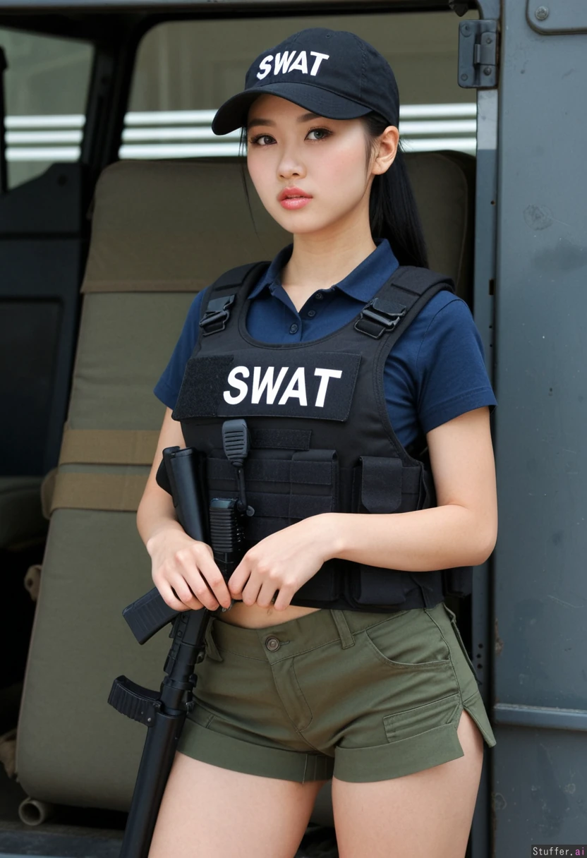 absurd res, 8k, perfect anatomy, masterpiece, 19 year old chinese woman, stunning pretty face, tactical swat agent, ,((black tactical swat vest)), beautiful chinky chinese face , beautiful small chinese eyes, cute straight black hair, very chinese supermodel, navy polo top, short sleeve polo green cargo_shorts, thicc, black baseball cap, SWAT special forces spy, badass swat agent, cargo dock, seductive face