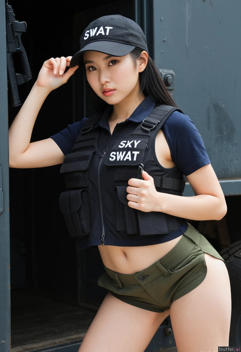 absurd res, 8k, perfect anatomy, masterpiece, 19 year old chinese woman, stunning pretty face, cute tactical swat agent, ,((black tactical swat vest)), beautiful chinky chinese face , beautiful small chinese eyes, cute straight black hair, very chinese supermodel, navy polo top, short sleeve polo green cargo_shorts, thicc, black baseball cap, SWAT special forces spy, swat agent, cargo dock, seductive face, exposed midriff